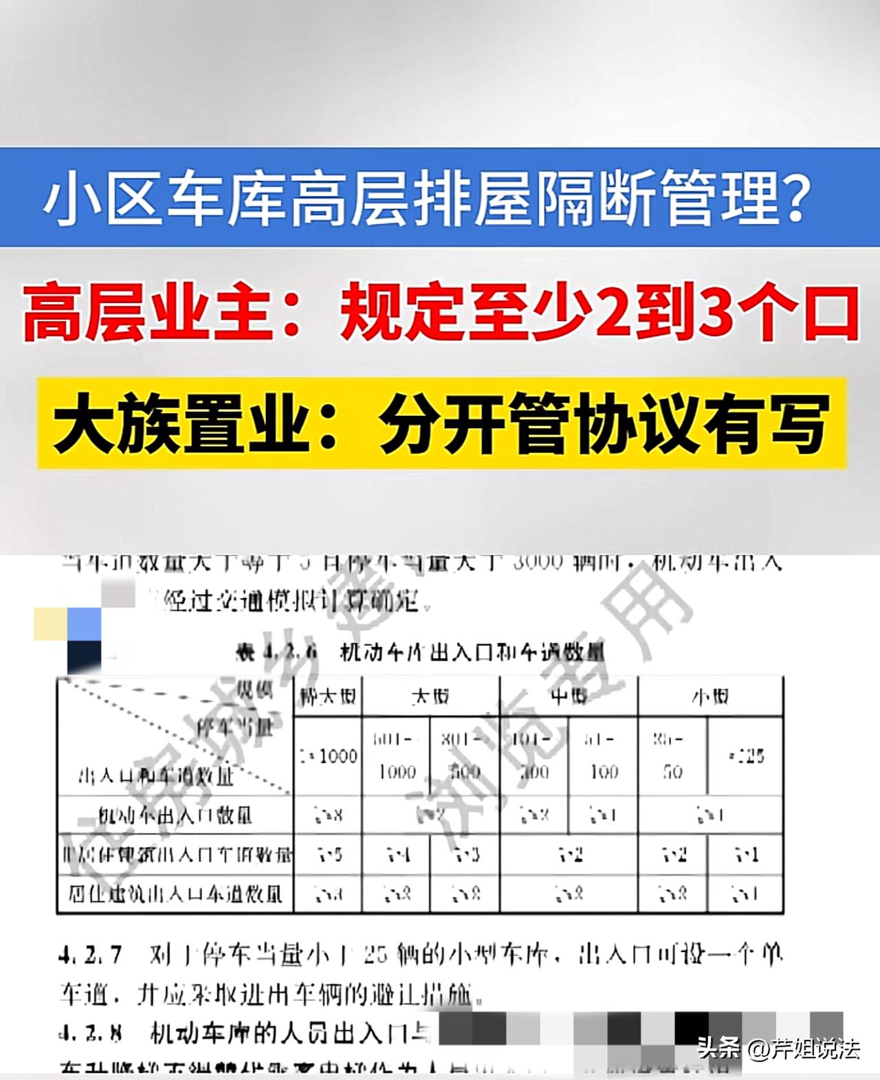 绍兴新昌,一业主表示自己的小区分高层区和排屋区,地下车库却被隔开了。平时该业主从东南门进来,可以笔直快速的开到自家车位,但现在走西北门就需要绕行。高层区500多辆车进出只有一个出入口。一遇上上班高峰期,地下车库经常就堵成一片,非常容易发生碰撞。 10月20日,据1818黄金眼报道,吕先生的小区分为高层区和排屋区,共用一个地下车库。吕先生是高层区的业主。 原本地下车库有两个入口,分别是靠近排屋区的东南门和高层后面的西北门。之前吕先生从东南门进来,可以笔直快速的开到自家车位。 现在物业为了把高层和排屋区分开,在地下车库安装了一个栅栏。不让我们高层的人从东南门进。我们只能从后门进入,但这也就要绕一大圈。 小区业主表示,22年的交房的时候,这个地方是有个防火卷帘门,一直是关闭着的,把排屋和高层区分开,那时候业主们去物业以及消防队反映了这个事情。消防人员说这个卷帘门是不能常闭的,于是这块就正常打开了,大家也都能从东南门进出。 之后由于排屋的人不满意,跟物业投诉,所以才有现在这道栅栏。 吕先生说,高层区有500多个车位,遇上上班高峰期,只能从东南门这一个口出去,非常容易发生碰撞问题。前几天就发生过碰撞事情,而且这个口出去车辆非常多,会车也很不方便。 高层业主们反映,按照当初车库建筑设计规范的合同来看,停车量在301到1000的机动车库,出入口数量要大于等于2个,现在高层区的车辆就有500多辆了。设置围栏后,相当于只有一个出入口了,不但影响生活,还存在安全隐患。 吕先生认为,应该按照我们国家法律规定,至少要开两个口到三个口让我们出行。 物业人员反馈,目前排屋区有200多个车位,高层大概在500个不到点。当初物业交付的时候,购房合同里也写明了会分式管理。开发商当初给业主买房的时候也都已经说过会分区管理。把高层区和排屋区两个区域分开管理。人是可以走的,就是车不能通行。当时我们卖的时候,也跟他们讲清楚了,排屋从东南边这个口子进,高层从西北边那个口子进,包括这个协议上也这样子写的。 有业主找出合同,上面写着高层区与别墅区中间有分区隔断,隔断区域独立使用。对于这个条款,业主们的理解不同。 有业主认为这是两个服务概念不一样,档次不一样。如果隔开之后变成一边一个出入口,这明显是不符合消防安全的。 规范服务分管式管理,高层业主们是认可的,毕竟排屋的物业费比高层的高一些,采取分管式管理也是理解的。但是公有道路是不分管的。 物业表示,在紧急的情况下,需要用到的时候,这个栅栏随时可以开的,这些门都是没锁的。 开发商的赵经理表示,地下车库是符合规范要求的,还出示了消防大队的回复,称消防卷帘门下降正常,符合要求,至于地下车库机动车通道的整体流通情况是不属于消防管理的。 赵经理说这么做也是出于分流的考虑,东南口有个幼儿园,每天上下学接送小孩,会导致这个口很繁忙,高层区的人如果也往这里过的话就非常容易造成交通堵塞。 记者找到新昌县住建局和规划局,住建局经过调查后回复,地下车库的整体建设是合规符合要求的。这个事情街道牵头把建设局、消防大队一起去邀请参与调解协商,调解之后,觉得这个事情肯定有一部分排屋的人觉得他的私密空间被侵犯了。原先交房的时候是跟他说的,各自的门出去互不影响,互不干扰的。通了之后,高层有些业主的车可能要停到那个别墅那边去就会霸占排屋的过道。 目前这个情况只能业主们之间协商有自己的一个统一的意见。 拉上栅栏,妨碍了高层业主的出入,不拉栅栏,排屋区的业务觉得她们的私密空间被侵犯了。虽然当初合同上已经写明了,会采取分管式管理,但这点当时没有说清楚,造成业主的误会,以为是物业费不通,服务待遇上的管理不同。 根据《汽车库设计规范》出入口数量与停车容量直接挂钩:特大型车库(>500辆):至少设置3个双向出入口,满足高峰时段车辆分流需求;大型车库(301-500辆):配置2个双向出入口,避免交通堵塞;中小型车库51-300辆:需设2个出入口;≤50辆:允许仅设1个出入口,但车道宽度需≥7米(双向)或≥5米(单向)。 根据规范要求来看,该小区车辆在500辆以内,也配置了东南口及西北口两个可双向进出的出入口。至于地下车库的区域占地划分,这个不归属于消防管辖。 物业应该在保证业主进出安全的情况下可以跟业主们好好协商这块。
