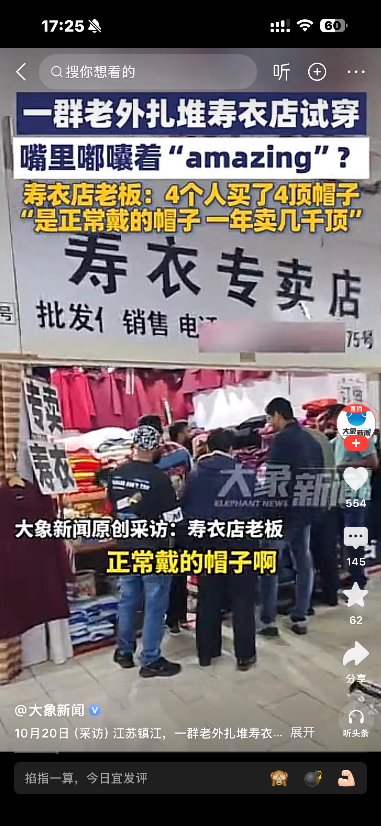 外国游客把寿衣当“唐装”?镇江店主:误会大了 一段视频刚火了:镇江一家卖寿衣的店里,几位外国游客把寿衣往身上套,场面一度尴尬。有人笑称“唐装店到了”,也有人问“这不是寿衣嘛?”这事儿一下就引爆网友讨论。 事情怎么回事 ?视频里,外籍顾客在店里挑衣服、试穿。店主说:“店里专门卖寿衣和百岁衣,并不是普通服饰店。看到对方把寿衣往身上一套,他当场觉得不对,就想跟人解释用途。可惜语言不通,他们坚持要买!”最后店主只好退一步,只卖了几顶适合老年人戴的帽子,没卖寿衣。 这事儿其实暴露了两点问题: 第一,语言和文化差异是导致事情尴尬的关键。衣服的“符号”被断章取义,这不就误会大了。 第二,明知道对方可能不懂,这钱,到底是赚合适还是不赚合适?这原本就难评,再加上现在短视频时代,几小时不到,评论区就热闹开了。碰上背景不全,还容易被带偏。 遇到这种事,你更同情游客还是支持店主?你觉得景区和店铺应该怎么做,才能减少这样的误会?欢迎在评论区聊聊。
