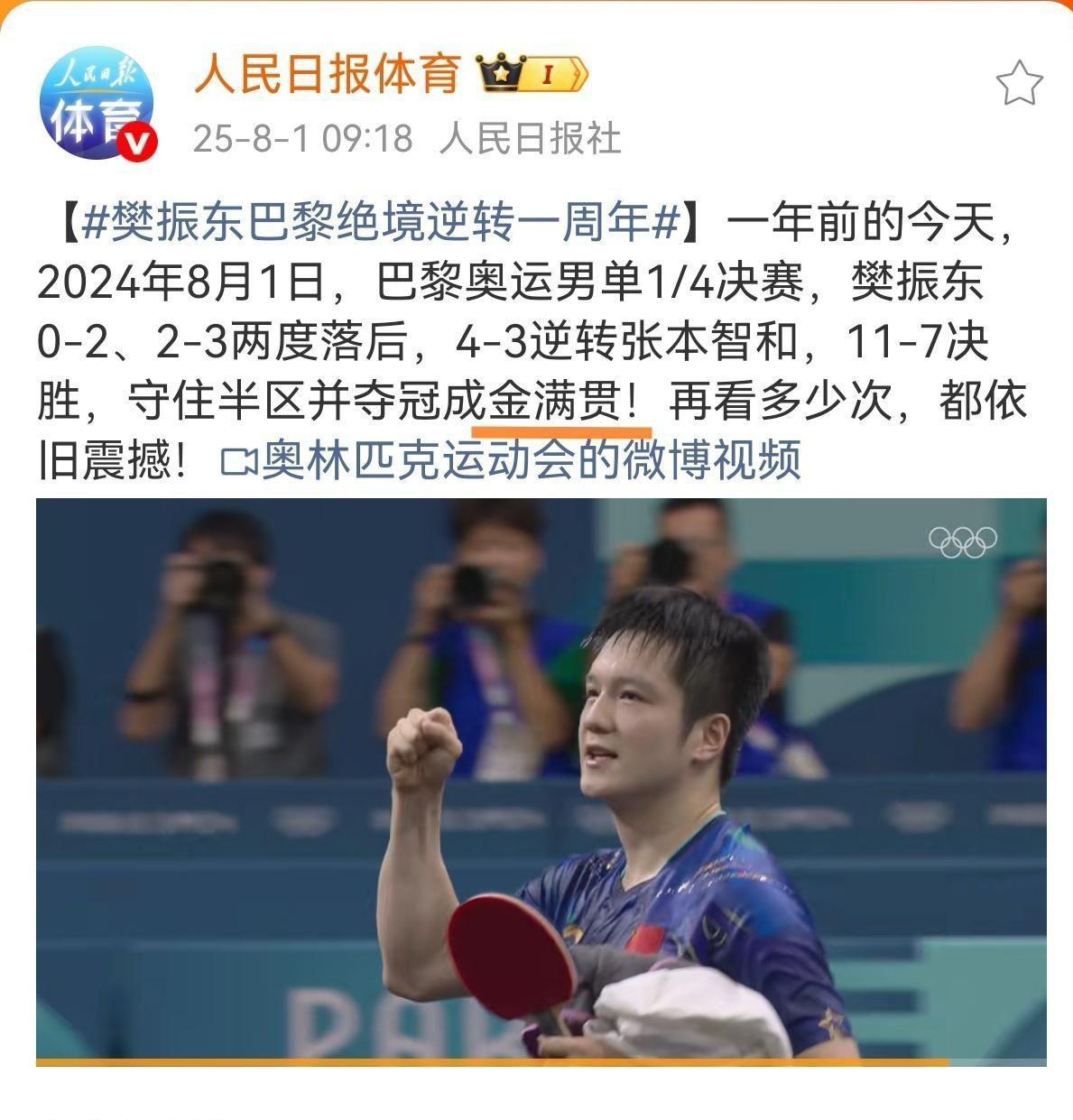 回国不到两周,樊振东被“人民日报”点名,张继科评价全内容 2025年10月6日,樊振东从德国打完比赛回国后不久,就被《人民日报》点名表扬 。《人民日报》表扬他不仅是因为他在巴黎奥运会上夺冠的辉煌成绩,更重要的是他身上所展现出的敬业精神和拼搏劲头 。作为一名军人运动员,他有着为国而战的使命感,回国后不休息,马上投入到训练中备战全运会,这种对事业的热爱和担当,以及他在赛场上展现出的坚韧不拔的意志和过硬的心理素质,都是《人民日报》对他进行表扬的原因 。 樊振东还以巴黎奥运乒乓球男单冠军身份C位入选“十四五体育成就”宣传阵容,获赞“赤子之心、凭实力说话”,其超级金满贯成就、抵制饭圈乱象等多方面被官方认可。 张继科对樊振东的评价满是认可与情谊,直播中被问谁反手最强,直言樊振东“毋庸置疑”,还将他排在自己和王皓之前,称其反手比自己当年更稳;被比较两人实力时,强调“为中国队拿冠军的都是强中之强”,否认谁强谁弱;早年就预言樊振东“一定是大满贯”,坦言“整天跟着我练,没法不是大满贯”;创办赛事时被问是否邀请樊振东,笑着说“小胖来就行、不用打”,尽显包容。此外,他还曾夸赞樊振东是“世界第一可爱”,多次公开肯定两人的队友兄弟情。