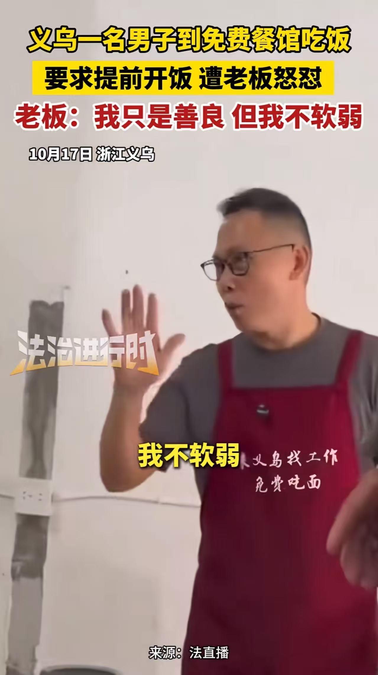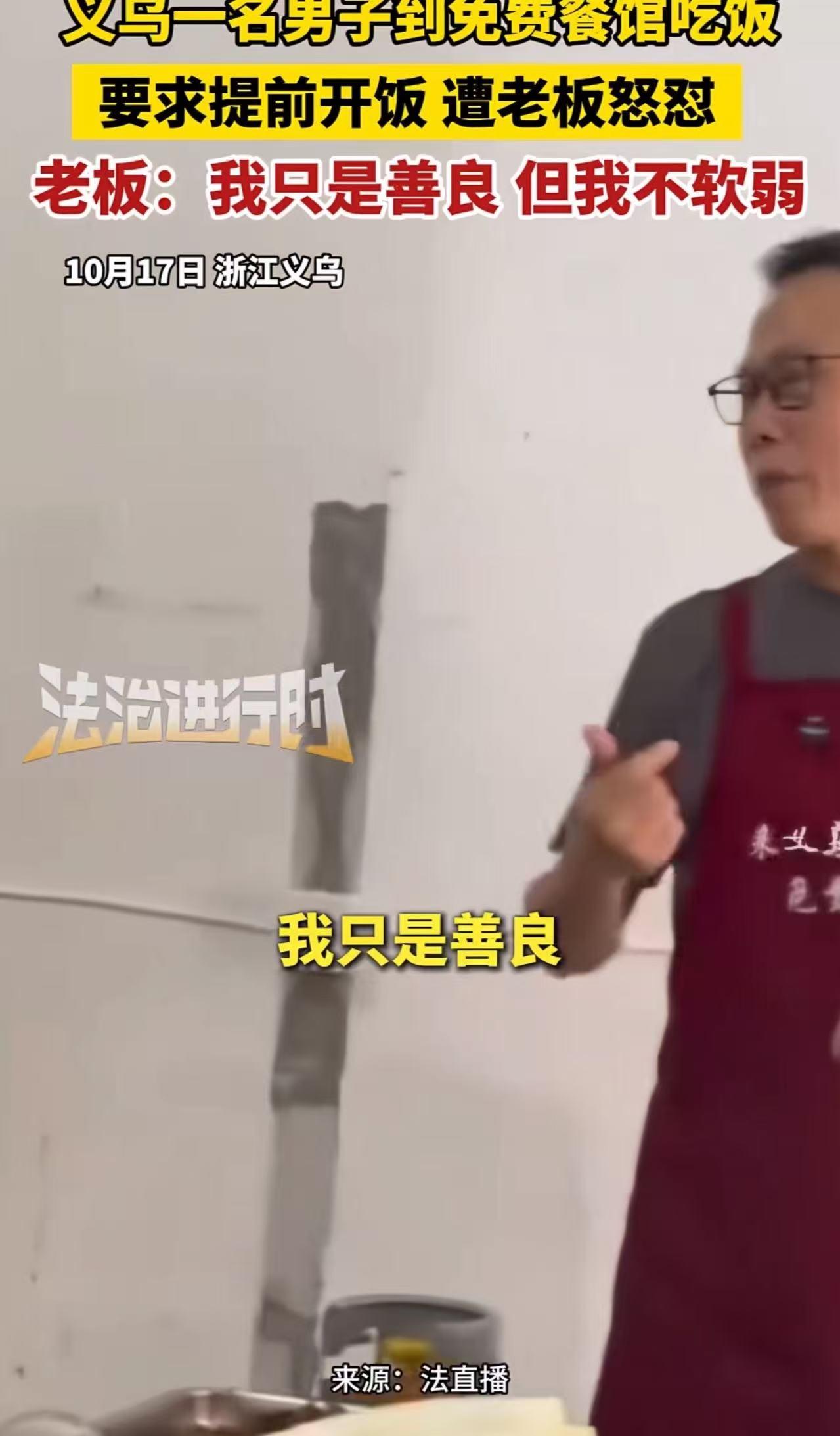 [中国赞]10月17日,义乌,一名男子到免费餐馆吃饭,要求提前开饭,遭老板怒怼:“我只是善良,但不是软弱,吃免费的饭还把自己当大爷了……”网友:老板怼得好!这种人不是遇到困难,是好吃懒做!吃免费的还那么硬气,惯的! (信源:红星新闻——免费饭馆老板回应“男子要求提前开饭”:对方没有恶意,后来也道歉了,不希望炒作) “能不能烧快点?都十点多了还不能吃饭,我肚子都饿扁了!”江苏一家爱心餐馆里,一名男子对着老板的怒吼声,打破了原本温馨的氛围。 谁能想到,这家明确写着“吃不起饭可免费就餐”的餐馆,老板好心提供热饭,却换来了这样的呵斥——更讽刺的是,男子全程没提“感谢”二字,反而像使唤店小二一样,把别人的善意当成了理所当然。 事情发生在一个普通的周三上午。这家开了三年的爱心餐馆,是周边困难人群的 “暖心驿站”:环卫工扫街累了能来喝碗热汤,流浪汉饿了能免费吃份饱饭,甚至刚毕业的大学生找不到工作,也能在这里蹭几顿热饭过渡。 老板李师傅的规矩很简单:“不用解释,不用道歉,坐下就有饭吃。” 三年来,来这儿的人大多心怀感激,有的吃完会主动帮着擦桌子,有的找到工作后还会回来送袋米,直到这名男子的出现。 当天上午十点刚过,男子空着肚子走进餐馆,看到后厨还在冒热气,没等老板开口,就径直走到柜台前拍桌催促。李师傅正在灶台前翻炒当天的大锅菜,听到吼声愣了一下 —— 以往来的食客哪怕再饿,也会轻声询问,从没见过这样理直气壮的。 他关掉火走到前厅,耐着性子解释:“大锅菜要焖透才入味,再等二十分钟就能开饭。” 可男子却不依不饶,反复强调 “我饿了”,甚至抱怨 “别人都说你这儿十点就开饭,怎么到我这儿就不行”。 这句话彻底点燃了李师傅的火气。他指着墙上“免费就餐”的牌子,声音提高了几分:“兄弟,我开这店是行善,不是当奴才的!你要是等得起,就找个位置坐下;等不起,出门左转有的是餐馆。 我善良不是软弱,你别在这儿发号施令——你不是大爷,我也不是店小二!”一番话掷地有声,男子瞬间哑口无言,脸涨得通红,却没转身离开,反而找了个角落坐下,直到饭菜做好,默默端着碗躲在一边吃。 这一幕被邻桌食客拍下来发到网上,很快冲上热搜。评论区里,网友们的态度出奇一致:“老板怼得好!善良就该带点锋芒”“给免费饭还被呵斥,这不是白眼狼是什么”。 有网友分享了自己的经历:“之前在小区门口喂流浪猫,后来有个大妈天天来要猫粮,一次没给就骂我‘没良心’,现在终于懂老板的感受了”;还有人犀利点评:“给狗块骨头还会摇尾巴,有的人接受了帮助,连句谢谢都没有,反而觉得别人欠他的”。 更唏嘘的是,现实中类似“善意被践踏”事件并不少见。去年郑州,一摊主免费为环卫工人提供早餐,一环卫工要求“每天多加个鸡蛋”遭拒后,称摊主“小气”。 杭州一老人长期给流浪人员送棉衣,一青年挑三拣四嫌衣服不时尚,还抱怨“怎么不送钱”。这些案例指向同一问题:善意无边界会成纵容,缺失感恩,善良会成软肋。 李师傅在后续采访中表示,他曾想关掉免费窗口,但看到真正困难的人小心翼翼进来,便舍不得了。他举例,有老太太捡瓶子,吃饭时会带干净塑料袋装垃圾;有小伙子找到工作后,连续一周来帮忙洗碗,称这些是他坚持的理由。 他还加了个小规矩,遇到态度蛮横的人,会直接告知“这里不欢迎你”,称不是自己小气,而是不想让真正需要帮助的人受这类人影响。 这件事戳中人心,道出很多行善者无奈:善良非单方面付出,更需被尊重与珍惜。如网友所言“升米恩,斗米仇”,给一碗饭,人会记好;天天给饭,人反觉缺东西。真正善意应是双向奔赴,受助者感恩,助人者守界,如此温暖方能传递。 如今路过那家爱心餐馆,仍有不少人排队吃饭,队伍里少了颐指气使,多了轻声道谢。李师傅表示会继续免费供餐,但不再让善良被人利用。毕竟,善良不是软弱,而是带锋芒的温暖,应给予懂得珍惜之人,而非被随意践踏。