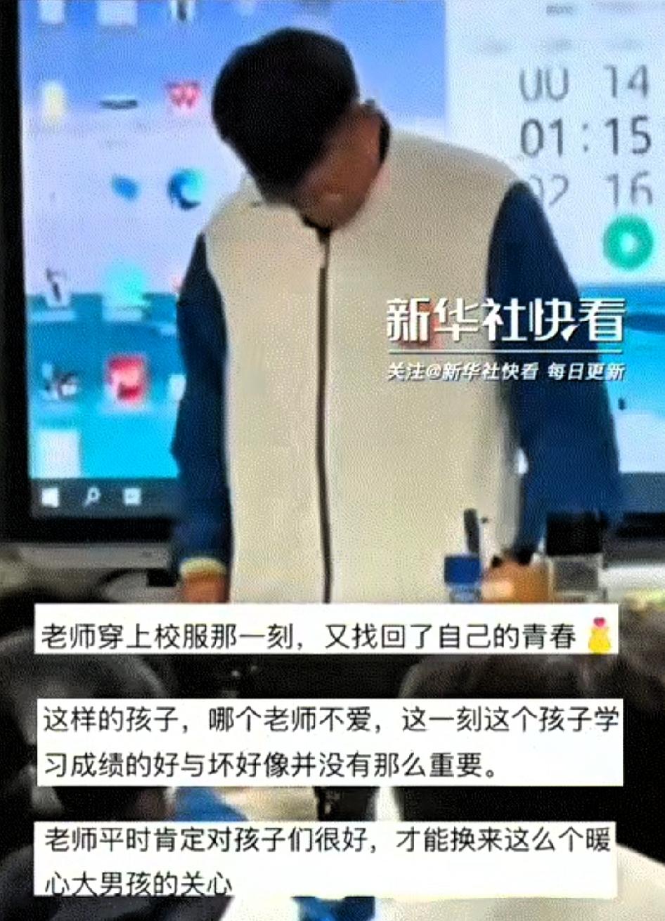 比满分更动人的, 是这声“老师,我的校服借你” 刷到贵州这位同学的举动时,真的瞬间被戳中!降温天里,老师穿着短袖在讲台旁微微发抖,后排男生没多想,直接脱了校服就走上前给老师披上。 别觉得这只是件小事,现在太多人习惯了被动接受善意,却忘了主动付出共情。教育的本质从来不是成绩单上的数字,而是把“爱人”这件事刻进骨子里。这个男生没说什么大道理,却用一个动作上了最生动的一课。 老师从惊讶拒绝到笑着穿上,全班响起的掌声,藏着最纯粹的温暖。比起考多少分,这种能敏锐捕捉他人需求的共情力,才是孩子未来最珍贵的财富。 你身边有没有过这样暖心的瞬间?来评论区和大家分享一下吧!
