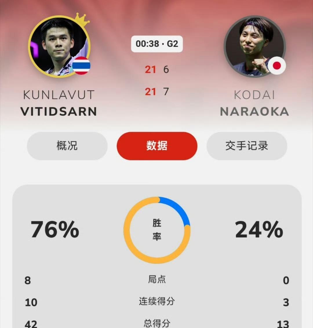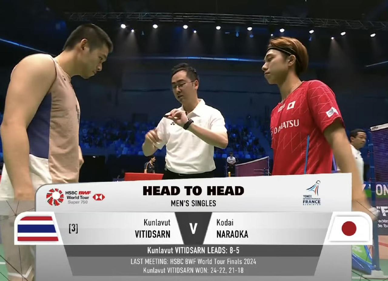 还真是,昆拉武特🇹🇭虽然胖了,竟然实力也变强了[捂脸], 第一局昆拉武特🇹🇭 打得非常灵活,最终以奇迹般的21-7的比分胜了🇯🇵奈良冈功大。 第二局开局更离谱,昆拉武特竟然打了个9-0,中局时昆昆11-1领先[捂脸],接着到了16-1,还好奈良冈功大终于又挣了几分,最终昆昆21-6又拿下了第二局[吐舌]! 看来奈良冈和昆昆已经不是一个水平了。 昆拉武特就轻松晋级了2025年法国羽毛球公开赛男单八强。 下一轮:昆拉武特🇹🇭 vs 🇮🇩法汉!
