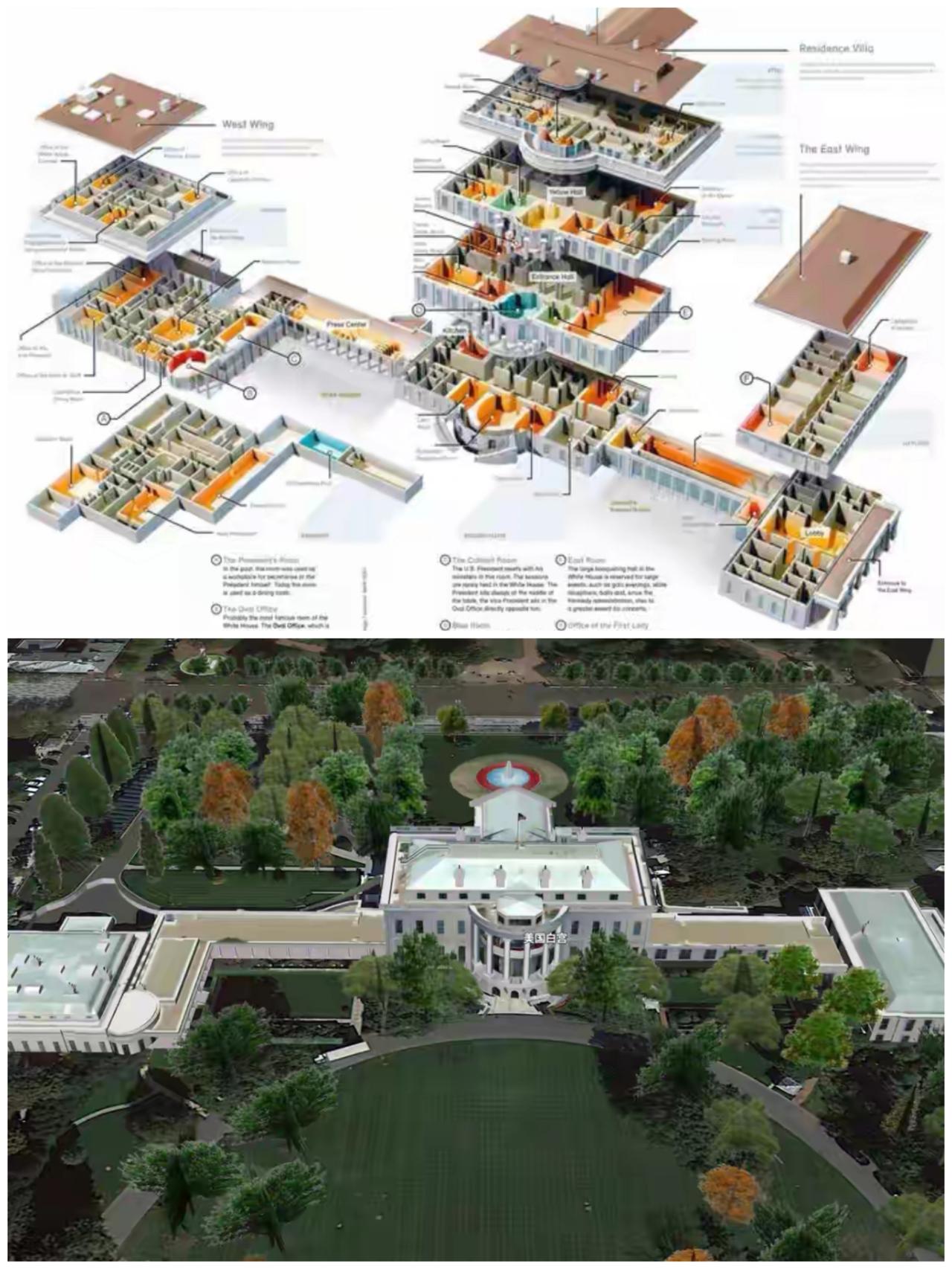 200多岁的白宫,东西两翼的建筑平衡感被完全打破了。 从图二可以看出,当东翼新建的9万平方英尺巨型宴会厅建成之时。 白宫这个老美的权力中心,将从西翼建筑稍高变为:东方大西方小,东升西低的局面。 老特这位房地产商出身的总统,对白宫做出了前所未有的大胆拆迁。 是不是也暗示着,老美这个国家将在这位开发商手中发生扑朔迷离的变化。