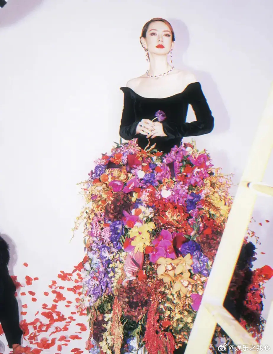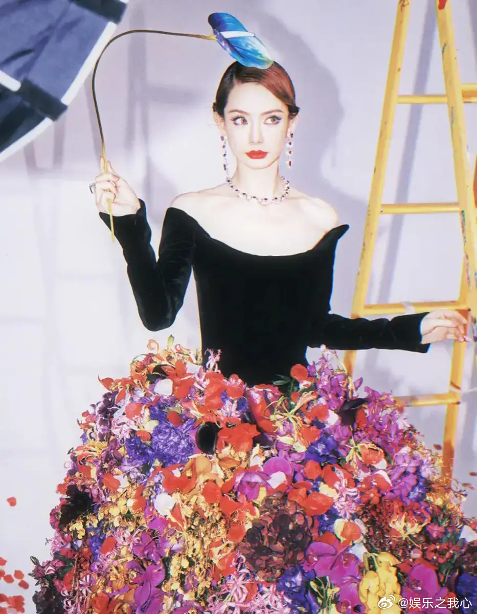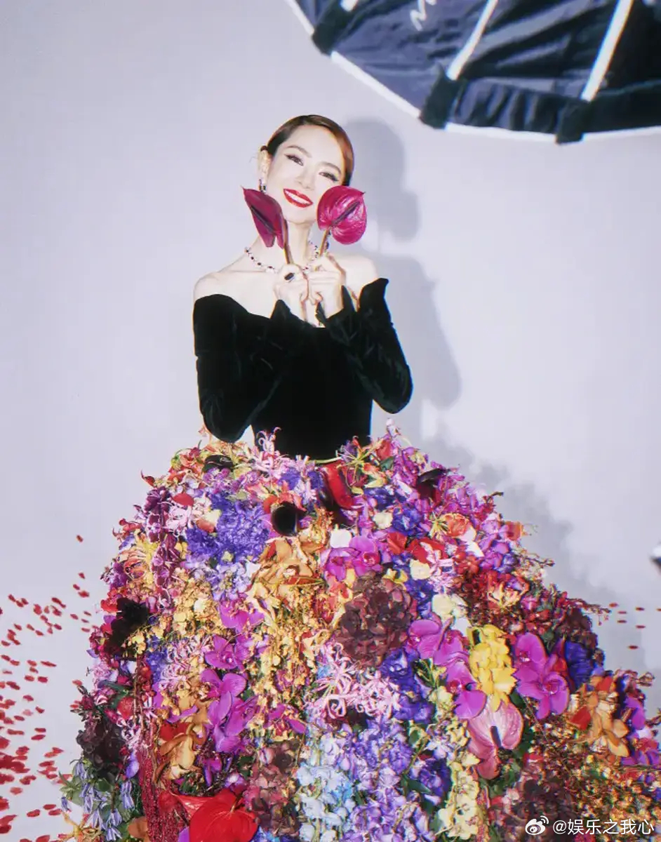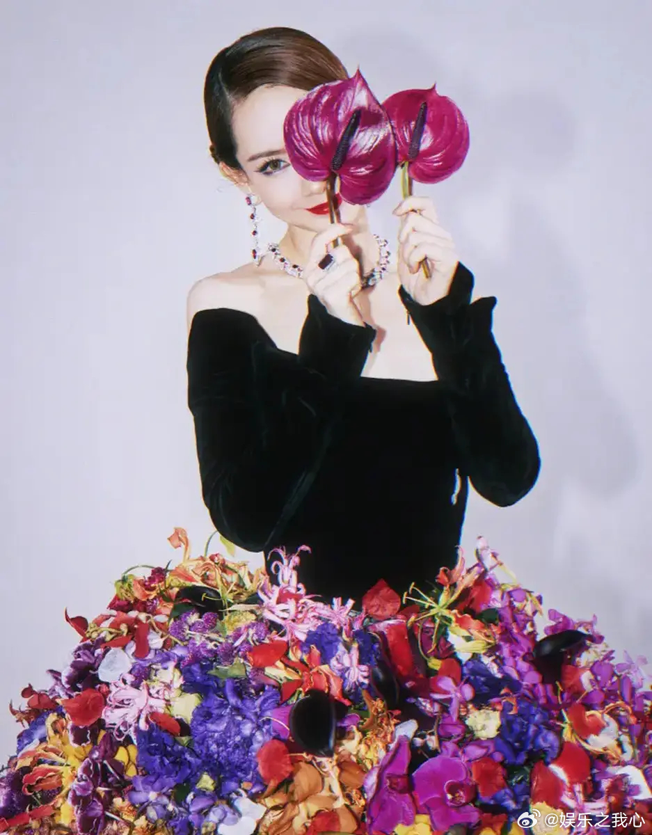 戚薇被花团簇拥明媚张扬 手拿蓝色羽毛表情灵动