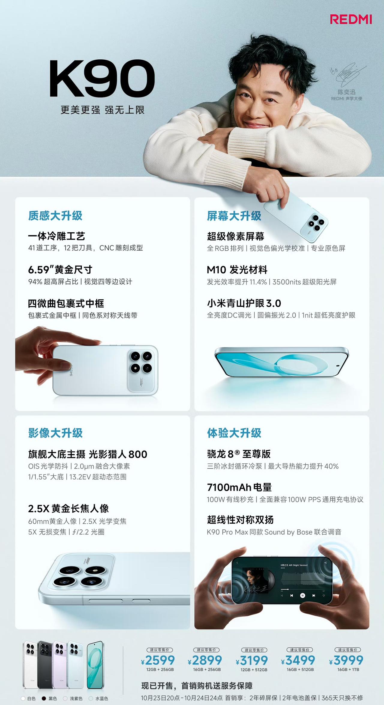 看到红米K90价格后,是我唐突了,2599起步,对标K80Pro反而降价,香麻了!简单总结配置 红米K90, 12+256GB——2599元 16+256GB——2899元 12+512GB——3199元 16+512GB ——3499元 16+1TB——3999元 1️⃣核心: ♢一体冷雕玻璃|金属中框 ♢骁龙8 Elite处理器+3阶冰封循环冷泵 ♢6.59"120Hz RGB OLED直屏 ♢7100mAh电池+100W有线+22.5W反充 2️⃣屏幕: ♢2510x1156分辨率|峰值3500nits|419ppi丨华星M10发光材料|视觉四等边|94%屏占比丨小米青山护眼3.0|全RGB无损排列丨全亮度DC|圆偏振光2.0|1nit暗光护眼 3️⃣影像: ♢主摄|50Mp 光影猎人800 1/1.55" F/1.88 ♢超广|8Mp 15mm 120°FOV F/2.2 ♢长焦|50Mp 60mm 1/2.88" F/2.2 2.5X直立 ♢前置|20Mp 1080p 60FPS拍摄 4️⃣外放: ♢1115F对称双扬声器|Bose联合调音 ♢全音量响度补偿|分场景调音|双风格调教 5️⃣外围: ♢X轴线性马达|红外遥控|NFC ♢IP68+IP69|双频GPS+双频北斗 ♢兼容公版100W PPS协议 ♢3D超声波指纹|小米星辰通信 红米K90标准版可以说升级很大,因为它对标升级的是K80 Pro,也就是这代的K90标准版就是Pro了。那这么看价格还是很香了 材质上一体冷雕玻璃后盖,跟iPhone17工艺一致,整体手感一致性会更好一点。屏幕上,从华星M9到M10,并且吃上了RGB像素独立排列的超级像素,显示色彩有所提升,另外亮度也比K80 Pro亮 影像方面主摄一致,但增加了2.5×直立长焦,并且给了新的影像算法,夜景动态范围提升了37%[吃瓜群众] 其他的就不说了,外放也是没对手,大家看参数就好咯,总之对比的是K80 Pro,没有了天玑芯片。实际上K90目前的竞争力还是有的,大家说呢?