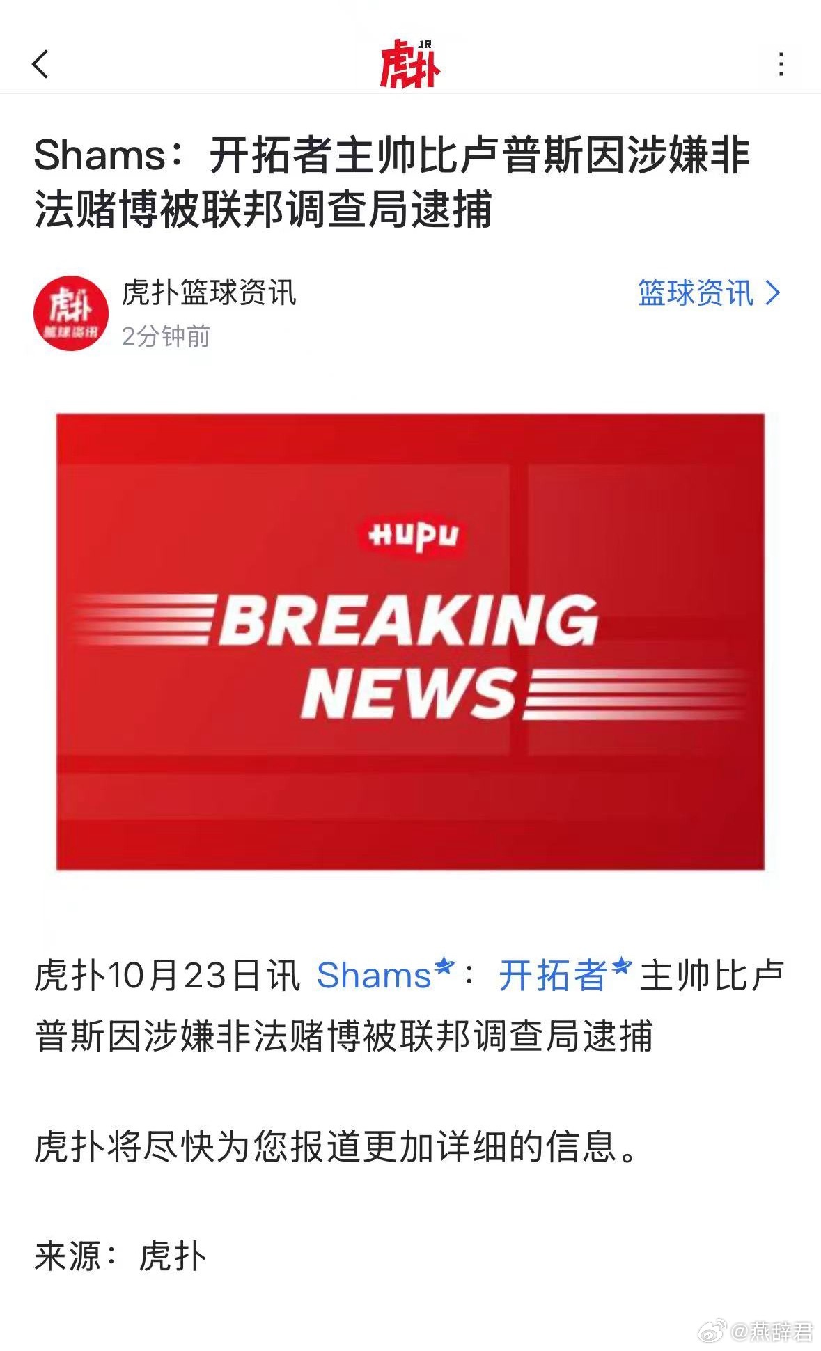 卧槽!开拓者主帅比卢普斯因为涉嫌非法赌博被FBI抓了!感觉这教练肯定要被换了,希望来个能更加重视小杨的教练杨瀚森[超话]