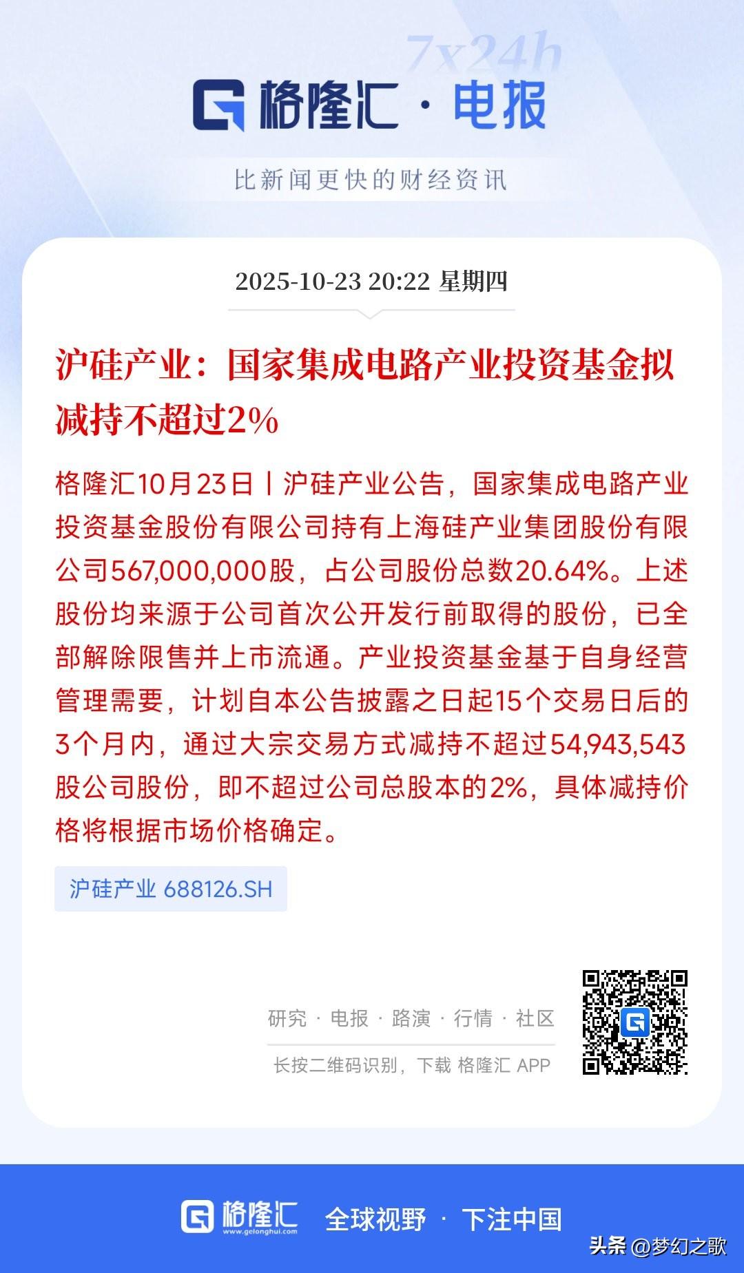 今天半导体大跌的原因来了,原来是龙头遭到减持 半导体龙头沪硅产业公告:国家集成产业投资基金减持不超过2%的股份。 按今天的收盘股价24.11元计算,沪硅产业的总市值为662.34亿元。减持2%的金额为662.34亿×2% =13.2468亿元。 虽然说减持2%对于沪硅产业来说确实不会影响长期的股价,但短期的股价还是会受到影响。尤其是跟风资金会受到打击,今天下跌了1.83%,明天将会考验整个半导体板块。 因为对于这种减持,会影响大多数股民的持股信心。