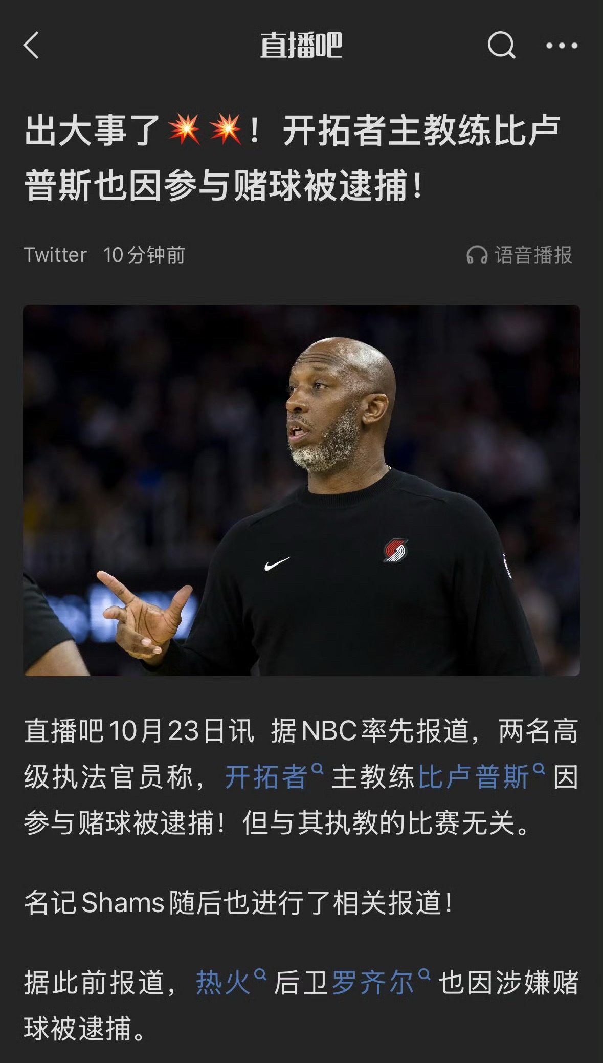 记Shams报道,波特兰开拓者队主帅昌西-比卢普斯因涉嫌非法赌博被联邦调查局(FBI)逮捕。