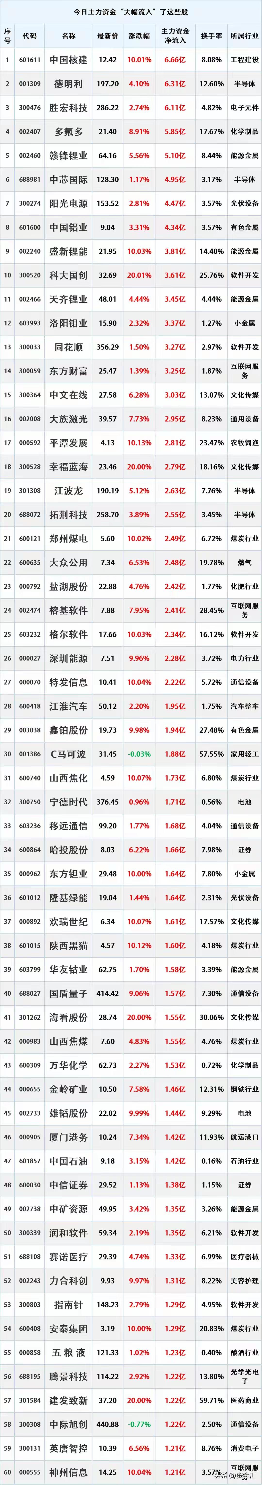 尾盘资金入场,10月23日主力资金大幅流入的股票名单。 资金流入是指在一定时期内(如一天、一周等),主动买入某只股票的资金量大于主动卖出该股票的资金量。主动买入是指投资者以卖方的报价直接成交,显示出投资者对该股票的积极购买意愿。
