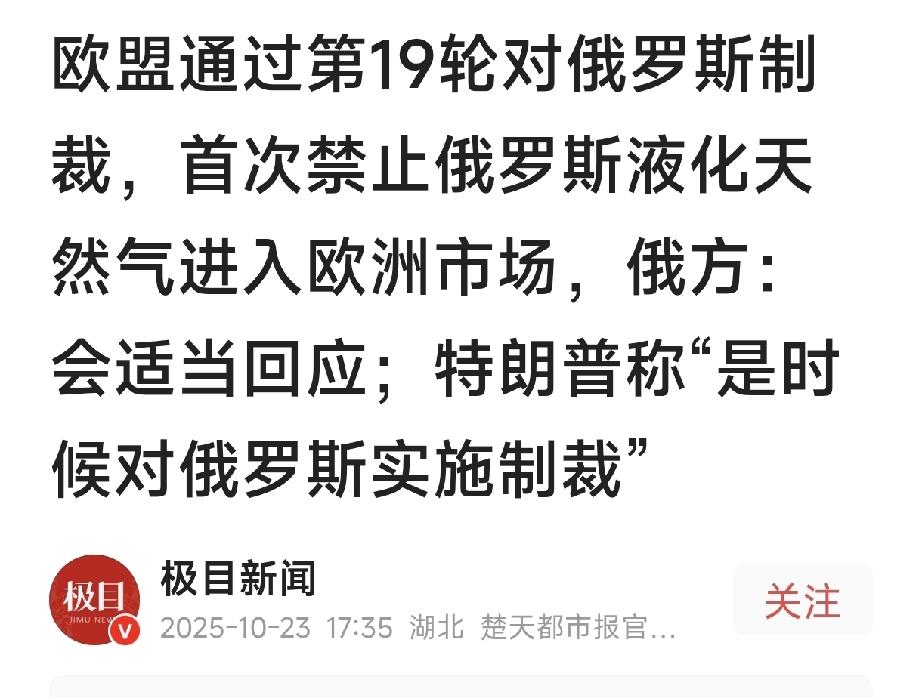 这事宛如乞丐叫嚣着制裁富豪,着实滑稽透顶!欧盟通过第19轮对俄制裁,首度禁止俄罗斯液化天然气进入欧洲市场;特朗普宣称“是时候对俄罗斯实施制裁”! 欧洲原本靠着俄罗斯天然气,日子过得十分惬意,如今却做出制裁给自己供应能源的国家这种有悖常理的事。难道西方人真的是“近亲繁殖”?否则实在难以理解他们如此行径。 特朗普制裁俄罗斯有两个好处,倒还能理解:其一,自己能买到便宜的俄罗斯油气;其二,欧洲不买俄罗斯油气,他便可以高价卖给欧洲。 欧洲的行为实在令人费解。