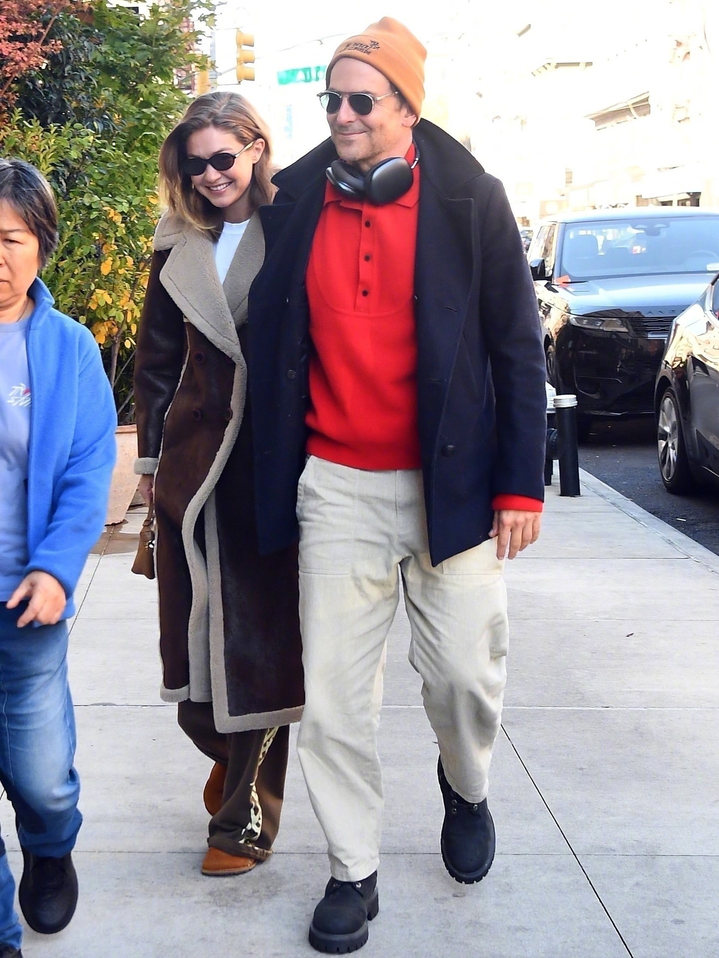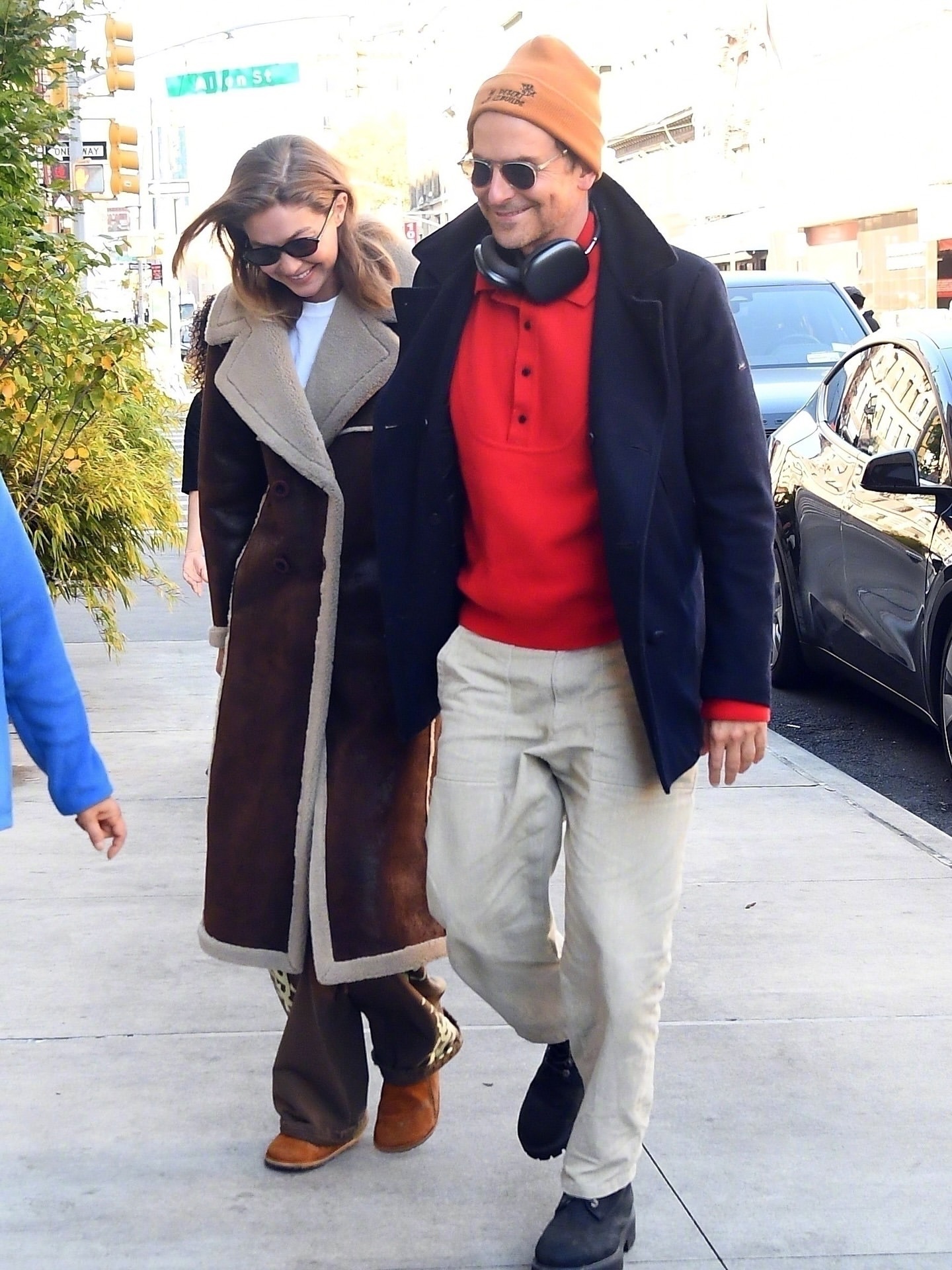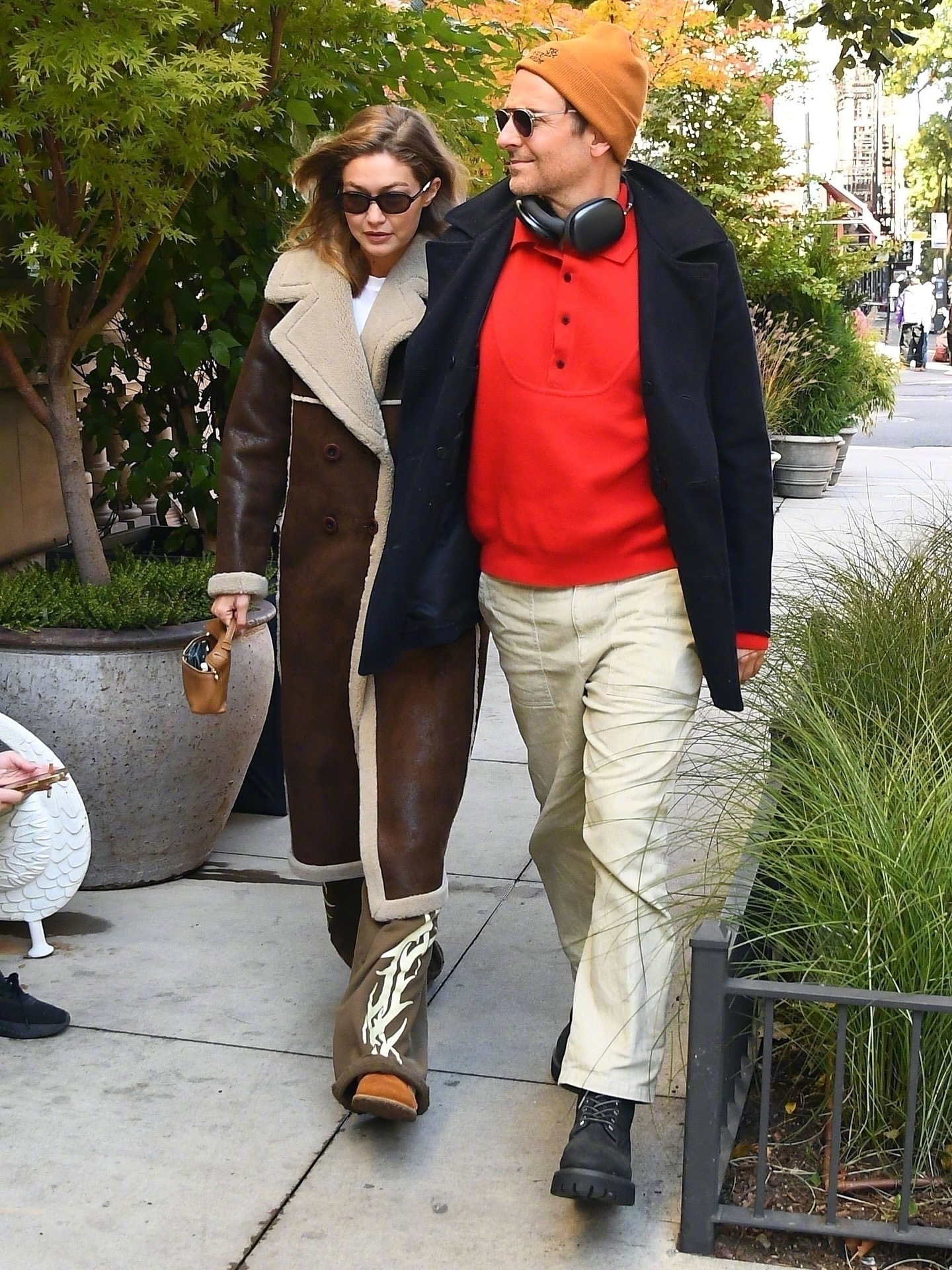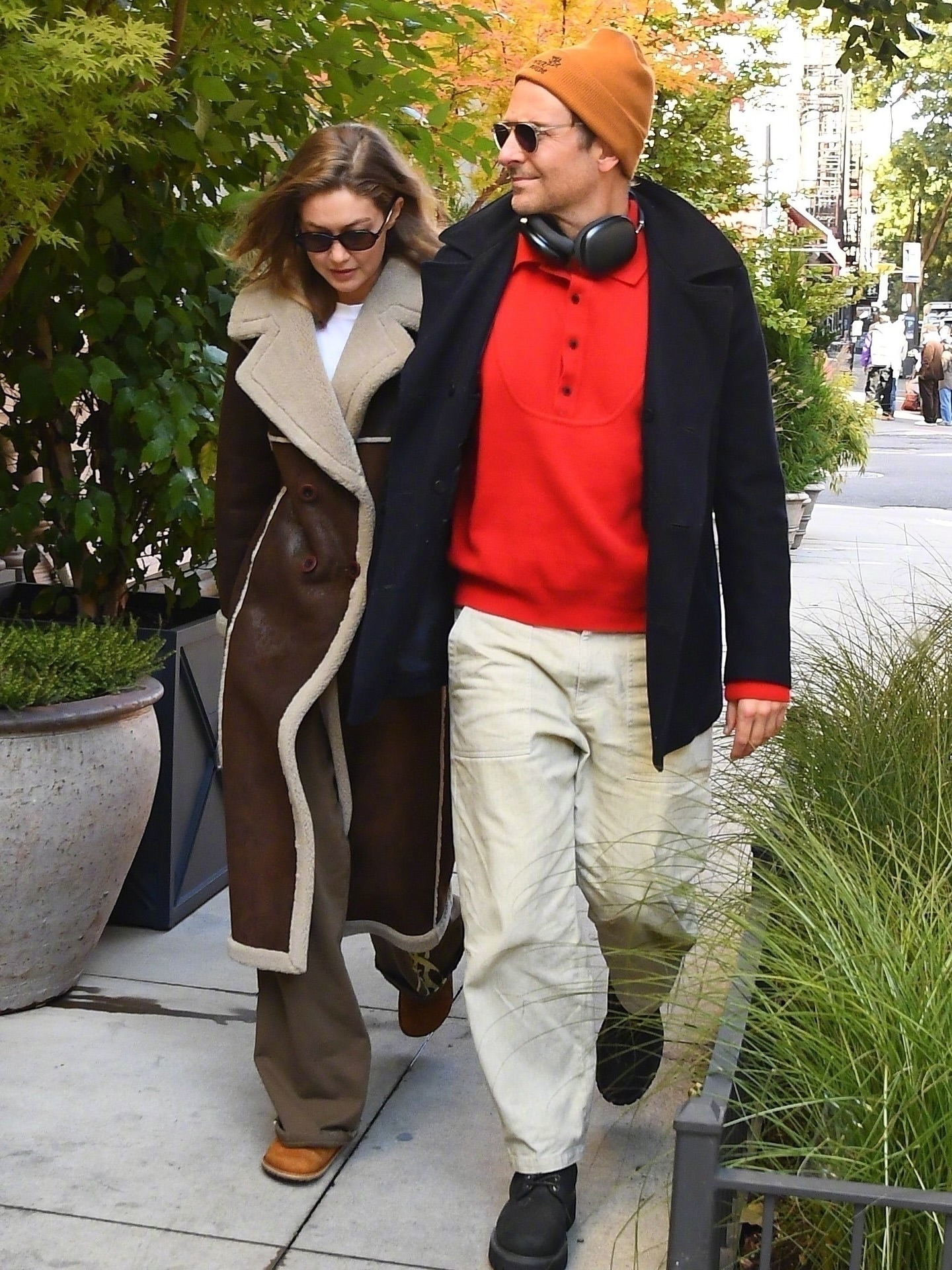 Gigi Hadid和男友库珀 Bradley Cooper 在纽约甜蜜外出的街拍。俩人感情很稳定,库珀身穿的红色羊绒衫应该是出自Gigi的品牌。