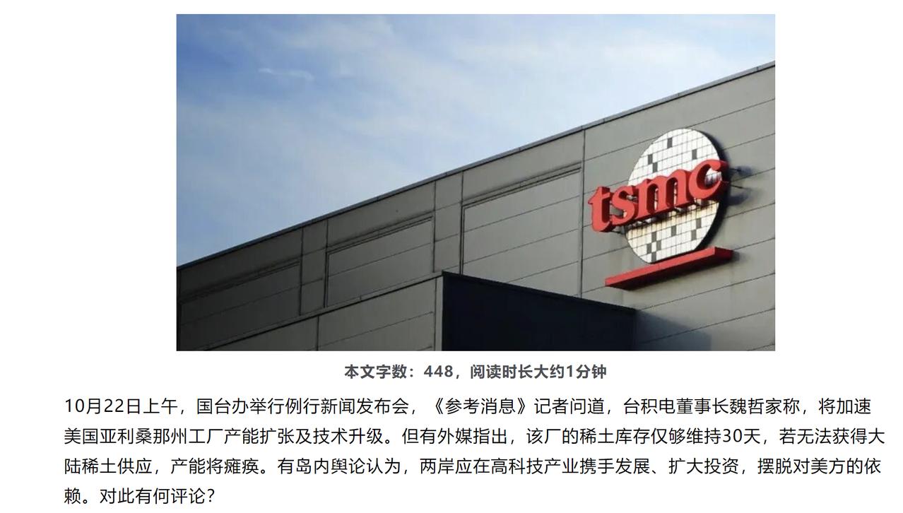 美国掏空台积电后,英伟达最强芯片实现美国制造,但是不要高兴太早,因缺少稀土,台积电美国工厂已面临瘫痪! 这两天,英伟达最强AI芯片实现美国制造,在掏空了台积电以后,台积电美国工厂已经正式投入运营,等到了2028年,台积电封测厂也投入运营以后,那么美国将打造集设计—制造—封测一体的高端芯片产业链。 不过听起来很美好,美国重新做到了高端芯片“全链条本土”,但核心环节全靠台积电,美国自己没有4纳米先进制程的制造能力,也没有对应的封测技术,所谓的“美国制造”,本质是“美国设计+台积电美国工厂生产”。如果不是台积电和三星心甘情愿被美国掏空,美国也没办法这么快做到这样的成就。 但是美国还是高兴的太早了,台积电发出警告,台积电美国工厂稀土只够维持30天,如果再没有稀土,那么台积电美国工厂就会瘫痪,要知道,EUV光刻机的精密驱动系统需要含钕、镝的钕铁硼磁体,每台消耗2.3公斤,且72小时就需要更换一次。 之前台湾地区每年进口的稀土中,96.1%来自大陆,总量约7000吨,而台积电一家的消耗量就接近6000吨,占岛内总需求的八成。 那特朗普宣称的1年以后,稀土应有尽有咋回事呢?原来是美国1家工厂能够生产纯度99.9%的氧化镝,1周能够生产2公斤。 这只能用来忽悠一下普通人,99.9%纯度属于3N级稀土,根本没有办法用于高新技术产业和高端武器制造,3N纯度的氧化镝在我国电商平台随便买,1克都只需要3块钱。中国现在已经可以大规模量产6N纯度的稀土。(99.9999%) 就美国现在的技术,如果想要突破中国的稀土管制,最起码也需要15年甚至更久,到时候,台积电美国工厂的设备都得生锈了。