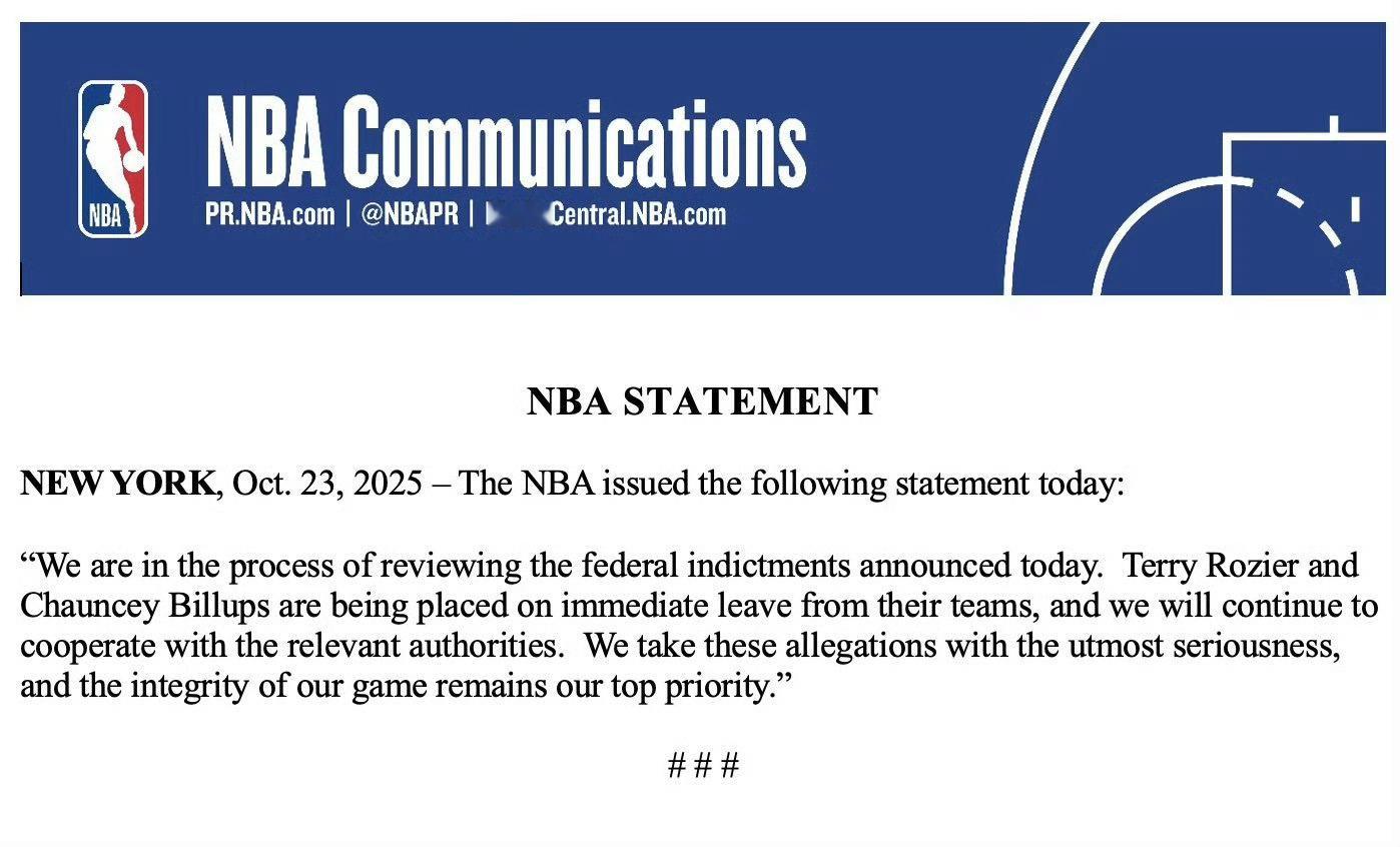NBA官方声明:比卢普斯和罗齐尔即刻被勒令离开所属球队