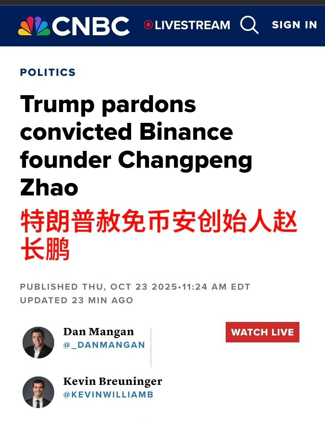 《华尔街日报》报道,特朗普总统已赦免加密货币交易所币安(Binance)被定罪的