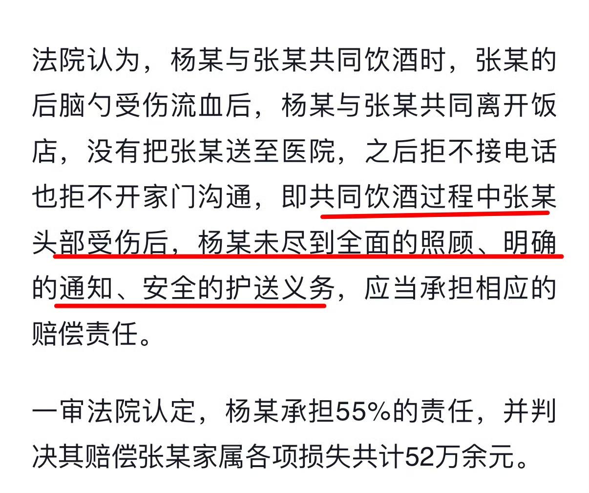 四个老同学聚餐,本来是想叙叙旧,结果酒一上桌,气氛就刹不住了。仨人轮着劝,一人闷头喝,不到两小时,老张就直接趴桌边吐,脸煞白。大家以为他“睡一会儿就好”,谁也没打120,反而继续划拳。晚上十点多,老张呼吸跟拉风箱似的,身子一抽,滑到地上了,这才慌了神。送到医院,医生一句“酒精中毒,没救了”,家属当场崩溃。 事后,老张老婆把同桌三个人全告了:说要不是你们拼命灌,我老公能喝成那样?法院一审把账算得明明白白:先走的俩人八点就离场,老张当时还能自己走两步,确实没法预见后面会出事,所以没责任;留下来的老杨就不一样了,他最后陪着老张,眼睁睁看人醉到不省人事,既没劝阻,也没送医,属于“没尽到照顾义务”,判他承担30%责任,赔52万多。 消息一出,网友炸锅。有人说“早走真香”,也有人说“以后谁还敢端杯”。其实法官不是和稀泥,就抓住一条:喝酒可以,但把人喝倒了,你得管到底。先走的那俩,法律上叫“无过错”;留下来的老杨,享受了酒桌热闹,就得承担后续风险。52万买条命,听着扎心,可更扎心的是老张家孩子才上小学,以后家长会永远缺个爸爸。 所以啊,酒桌别逞英雄,更别劝酒,真出事了,谁最后陪在旁边,谁就可能背锅。想彻底安全,要么别喝,要么早走,要么把醉汉亲手交给医生,别等救护车来了才后悔。 (来源:红星新闻)