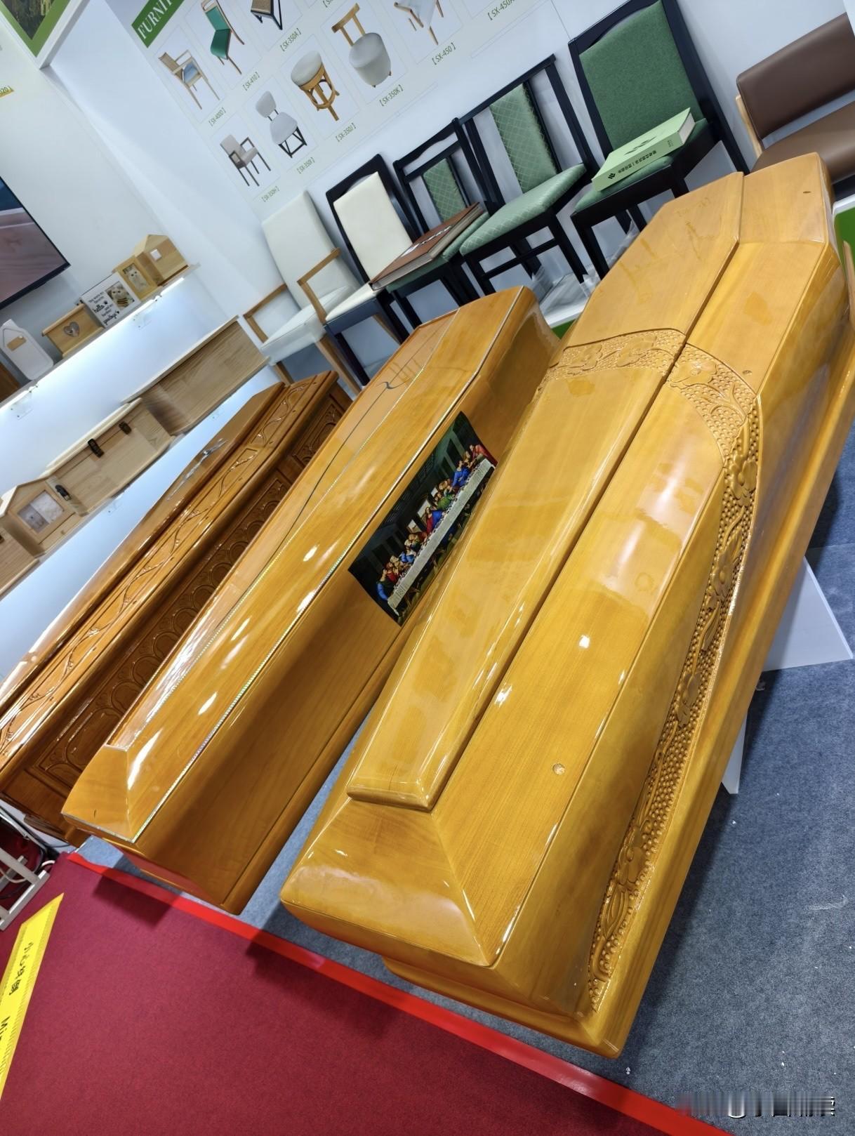 哇塞,棺材都开进了广交会,这宣传力度真够猛的!看这样式与传统的风格好像完全不同啊,中国人应该不喜欢吧?还有宠物棺材,想想既然把宠物装进棺材,那至少还得准备一块墓地吧,这得多少钱啊,也只有钱人才有这个需求吧?