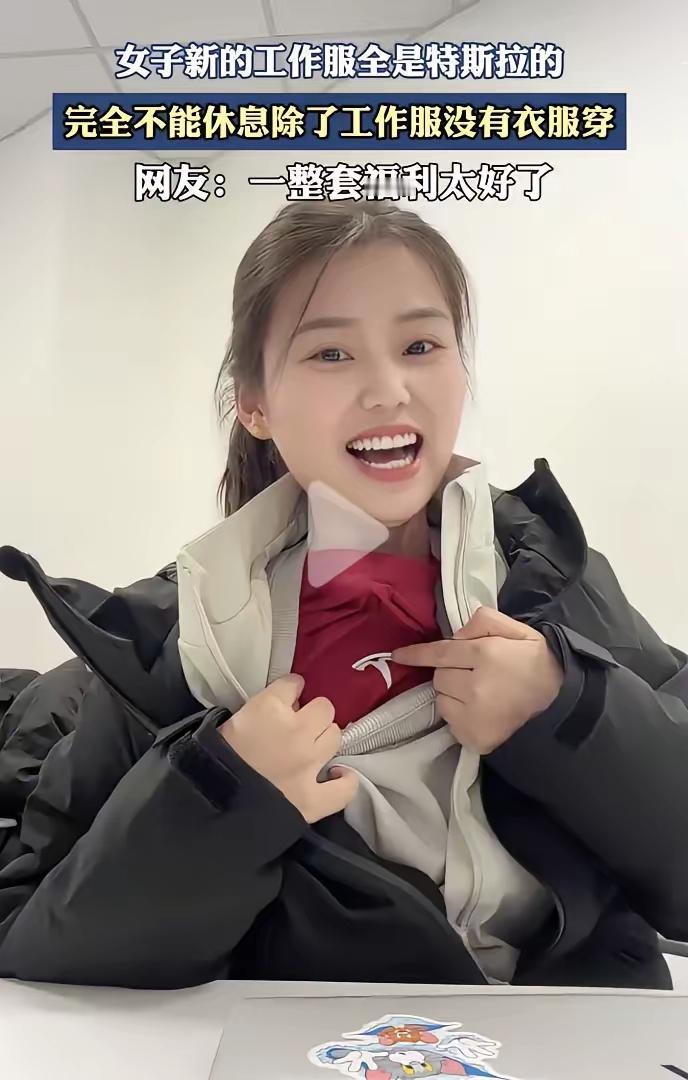 美死了,这看到特斯拉的小姐姐上班工作服,我真的是羡慕了啊,不能比,这才知道什么叫做最可怜的打工人。 小姐姐呢是特斯拉的工人,最近呢晒出视频,视频中自己身穿特斯拉的工作服,从外到内,一件一件的全部是特斯拉发的工作服, 网友更是调侃,这不是在公司上班,这完全就是住在公司了,当然能够让员工喜欢上穿工作服的仅此一家了。 毕竟工作服的款式很潮流,不管是风格还是材质可以说都是顶流的存在,再看看自己身上的工作服,一年四季就一身,脏的跟抹桌布一样,实在是可悲。
