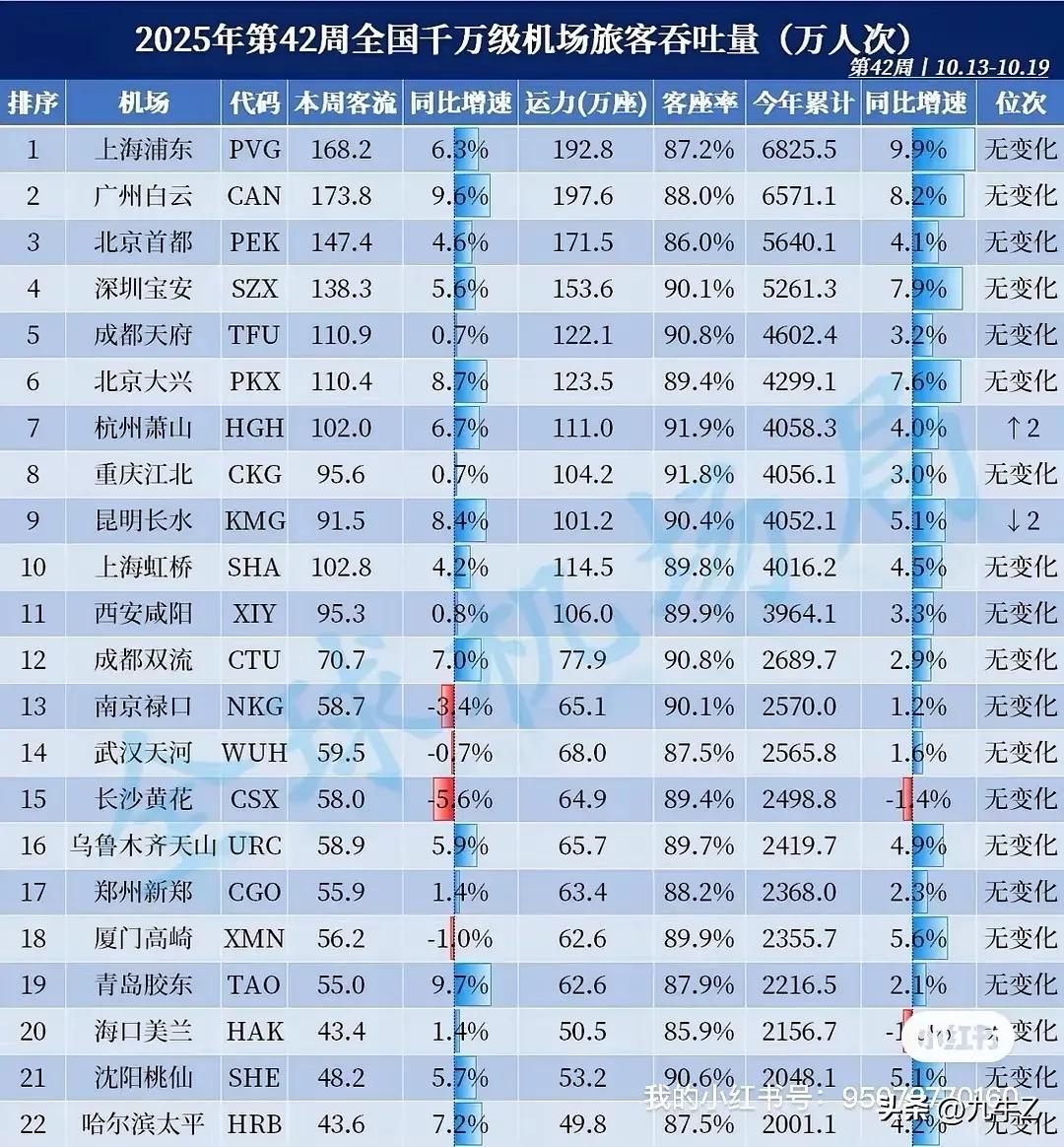 昆明长水机场的客流在近两个星期直接掉了两位,今年年底能不能上5千万大关?个人觉得比较难,已经被杭州萧山超过了,而且还被重庆江北机场超过了,要想坐回曾经的位置是比较困难的了,如果能保持前十的位置应该可以,因为昆明的冬天的季节不冷,而且还有红嘴鸥,到时候观鸥的游客会上一波,主要还是近几年云南高铁的陆续开通,以前第六的名次是怕再也回不去了。以上仅供参考,属个人意见!