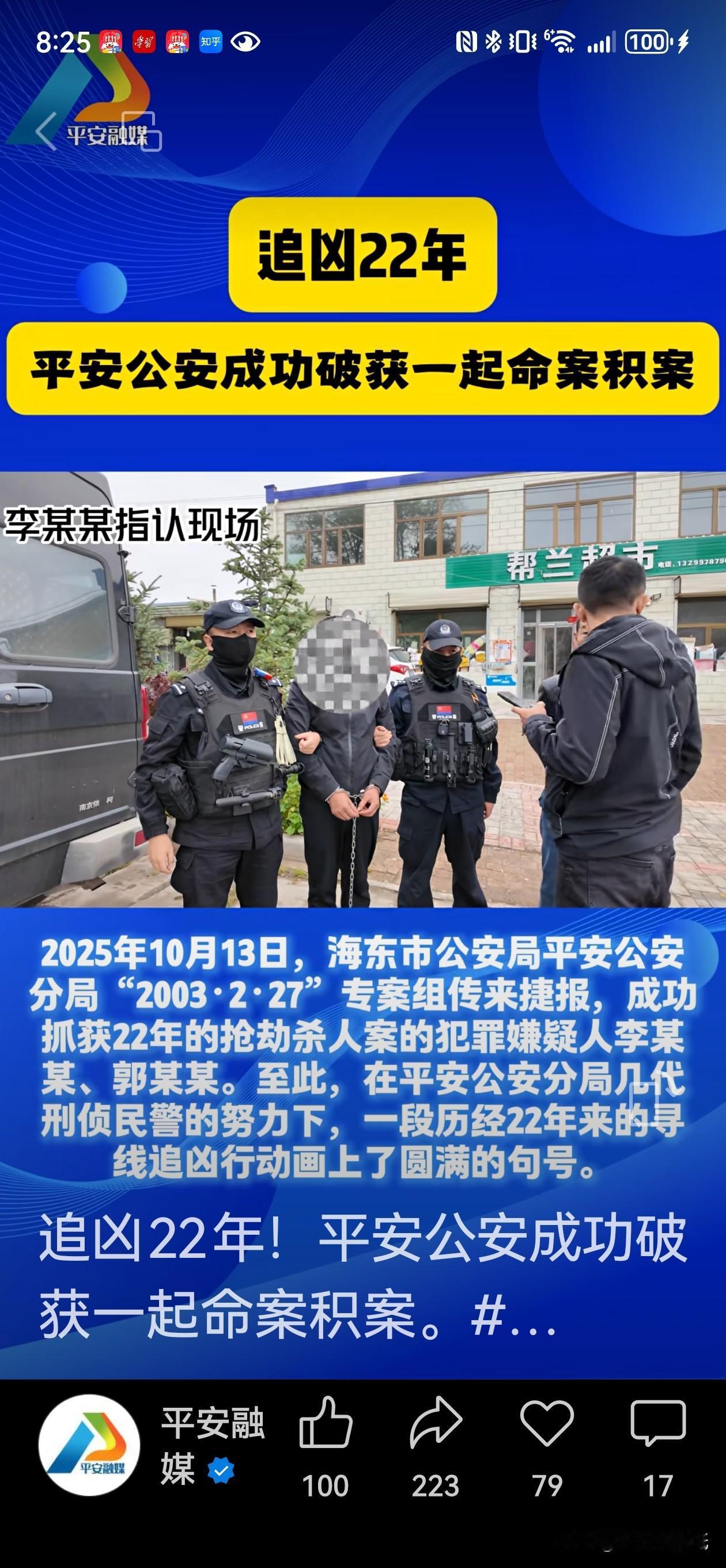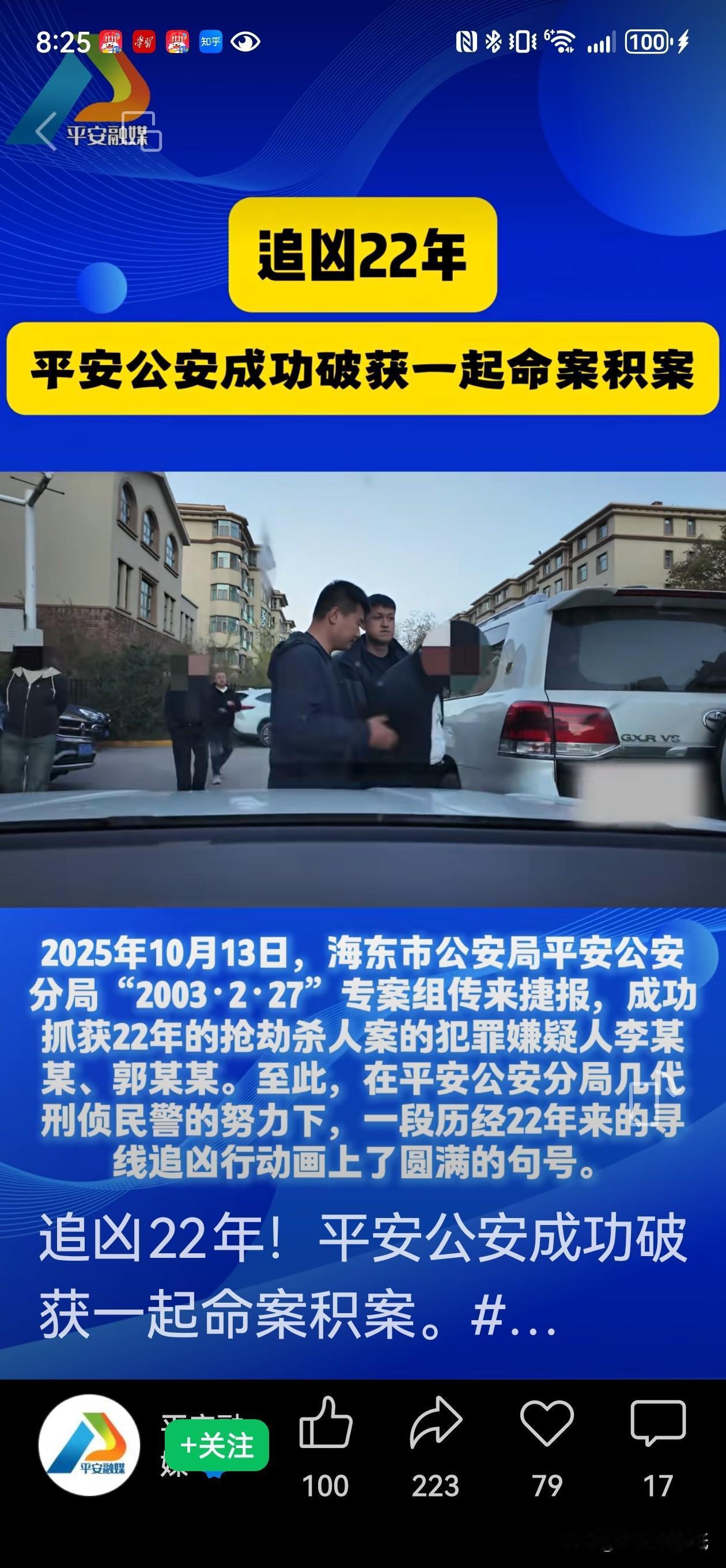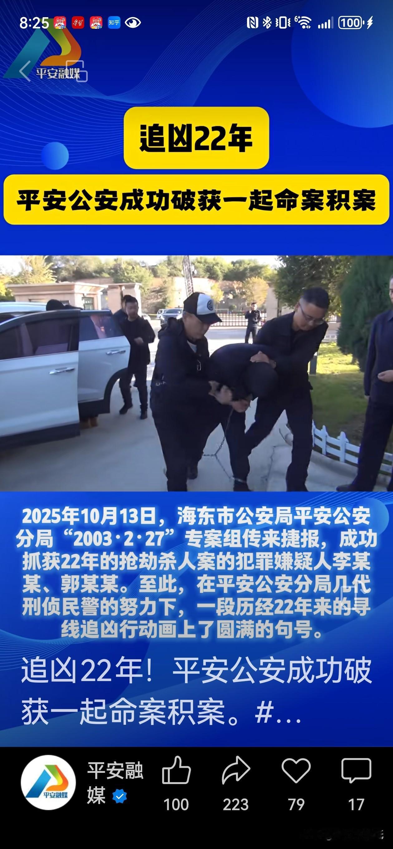 22年!青海公安擒获“青沙山双魔”,抢劫杀人命案积案告破! 青沙山下,一起尘封22年的血案,在2025年的秋天,终于等来了它的答案。2025年10月13日,海东平安公安局的欢呼声划破长空。随着李某某、郭某某落网,这起尘封22年的“2003·2·27”抢劫杀人案得以告破。 2003年2月27日夜,那个寒冷的夜晚,青沙山下,被害人马某车辆遭劫,车牌被卸下,凶手消失在夜色里,马某终因抢救无效死亡。案子只留下一个漫长的谜题。线索一度中断,但平安公安的案卷从未合上。 22年,几代刑警白了头。当年勘查现场提取的物证,像一颗沉默的种子,被小心保存,直到今天与“专业+机制+大数据”的新型警务模式相遇。海量数据碰撞出火花,让逃亡后藏身人海的郭某某和李某某,终于浮出水面。 专案组民警循着蛛丝马迹横跨数省6000多公里,最终在格尔木将两人一举擒获。 天网恢恢,疏而不漏。这场跨越了22年的追凶,不仅告慰了逝者,更向所有人宣告:有些债,时间也抹不掉,正义终会叩响你的门。 秋日生活打卡季