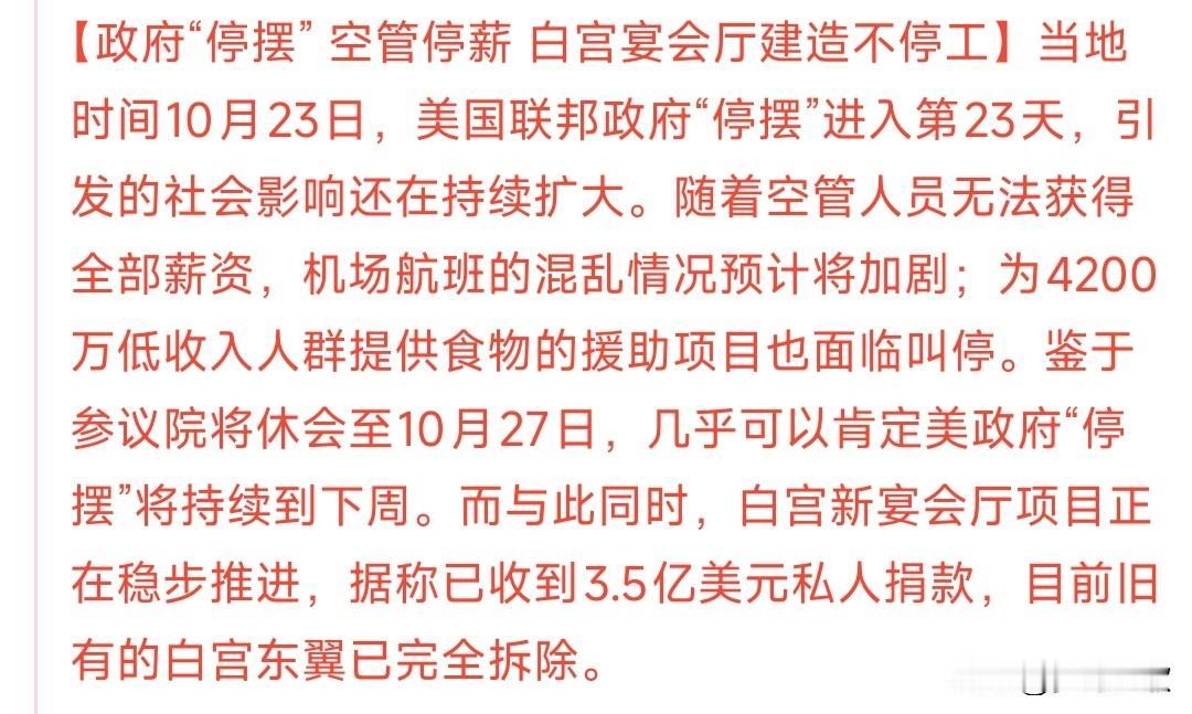 美国政府停摆已经影响到飞机场的起降,但白宫的建造没有任何影响 美国政府停摆已经进入到了第三周,从现在两党的决策上面看,还是互相没有妥协的意思,也就是说停摆可能还会持续下去,可能再次创纪录。 但有意思的是白宫改造项目并没有停工,这些钱都是来自大众的捐款,而此需要花费2万亿到3万亿,如果这些钱用到政府上面,可以暂时恢复政府职能。 现在美国政府停摆已经造成了直接经济损失大约150万亿美元,这将对GDP造成很大的影响。