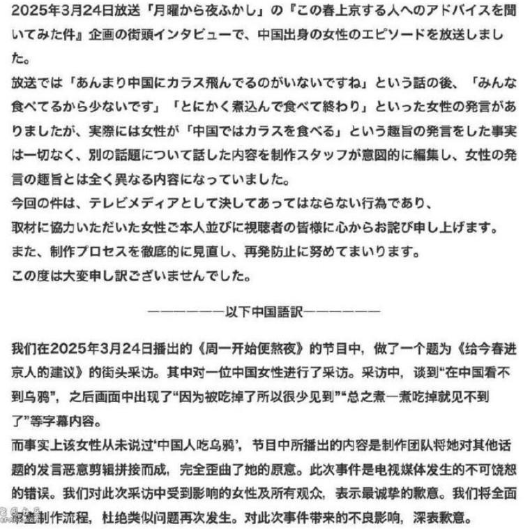 事情起因是在今年3与额,日本电视台综艺节目《月曜夜未央》在街头采访中,将一名中国女性关于“中国少见乌鸦”(因乌鸦偷衣架)和“爱吃乳鸽火锅”的表述恶意拼接,剪辑成“中国人因食用乌鸦导致乌鸦减少”的虚假结论。 这直接导致该女子被恶意攻击,遭受到了大量网暴。 在事发近7个月后,日本放送伦理及番组向上机构发布报告,认定节目组**“违反新闻伦理”,属于“为博眼球任意篡改内容、制造虚假信息。 随后,日本电视台社长福田博之公开道歉,承认剪辑“完全歪曲原意”;节目官网发布中日双语道歉声明,承诺整改制作流程;停争议性街头采访环节。 只是该电视台并未提及赔偿或心理援助。 这种恶意剪辑的行为,不仅仅是新闻失范,更是对跨文化尊重的践踏,真实与客观才是媒体生命线。如此刻意制造冲突性内容,需通过国际舆论监督持续纠偏。