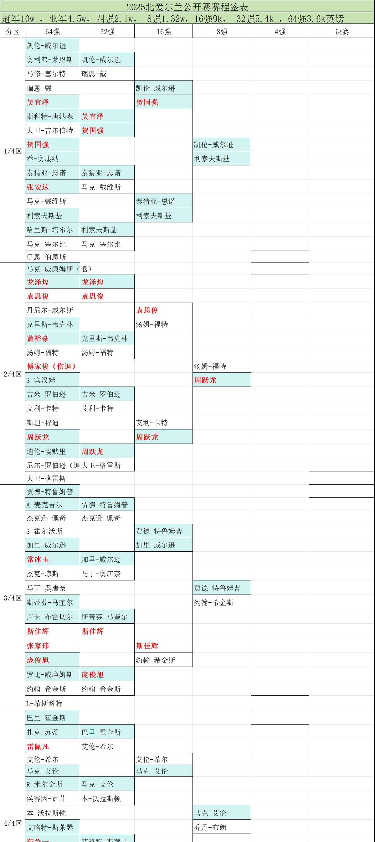 北爱尔兰公开赛八强已出炉,签表更新,周跃龙独闯! 2025斯诺克北爱公开赛八强战今天晚上21点开始打响。 中国选手:周跃龙。 国外选手:贾德·特鲁姆普,杰克·利索夫斯基 ,马克·艾伦 ,约翰·希金斯,凯伦·威尔逊 , 乔丹·布朗, 汤姆·福德。 #2025斯诺克北爱尔兰公开赛# #周跃龙#