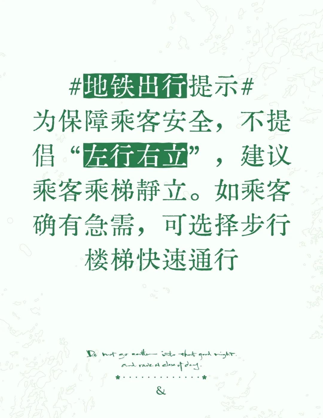 建议所有人注意到地铁新提示 地铁出行提示 为保障乘客安全,不提倡“左行右立”,建议乘客乘梯静立。如乘客确有急需,可选择步行楼梯快速通行。地铁 拥挤的地铁高峰 地铁上的左行右立