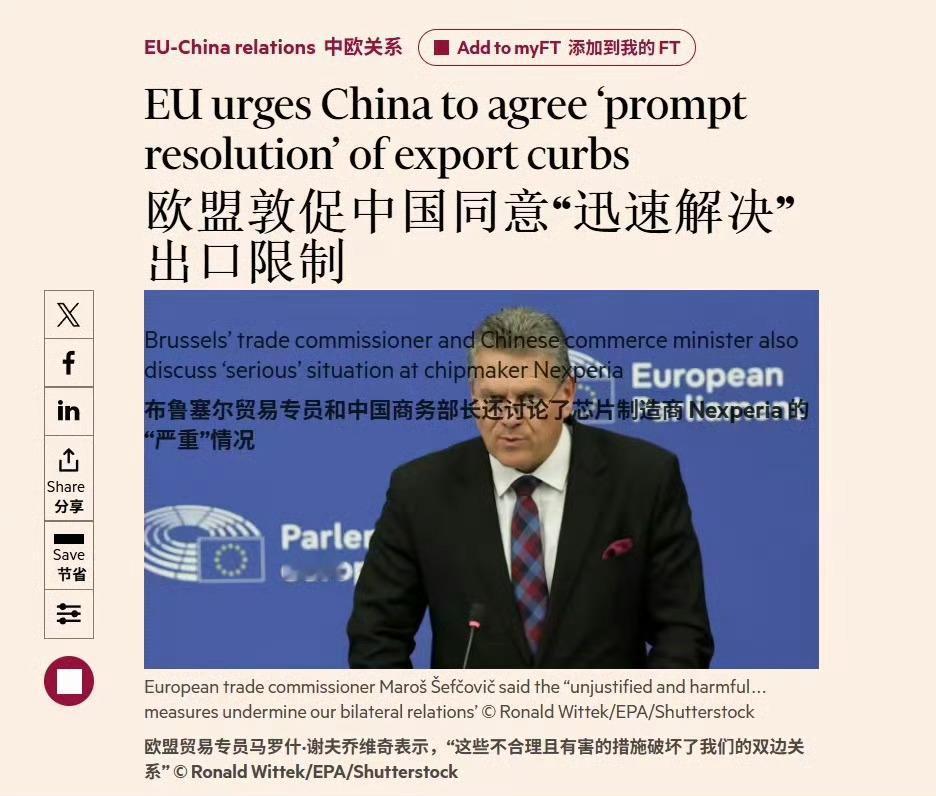 欧盟:希望中方不要将安世问题闹大,并且放宽对欧稀土出口管制! 你们随便抢劫中国的公司,在全世界做了一个最坏的范例,破坏了世界运行的基本道义,还要求人家放过你们,谁给你们的脸啊,真是恬不知耻。 还敦促我们同意“迅速解决”出口限制? 脸皮是真的厚,说明他们这次是真的急了,但我们不急,慢慢拖一拖。