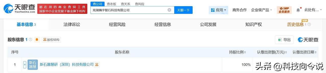 【新石器无人车在芜湖成立智行科技公司】 天眼查工商信息显示,近日,芜湖熵宇智行科技有限公司成立,法定代表人为李子夷,注册资本100万人民币,经营范围含智能机器人销售、工业机器人销售、服务消费机器人销售、智能机器人的研发、新能源汽车换电设施销售、人工智能硬件销售、新能源汽车整车销售、新能源汽车电附件销售、新能源汽车生产测试设备销售等。股东信息显示,该公司由新石器慧研(深圳)科技有限公司全资持股。 天眼查信息:
