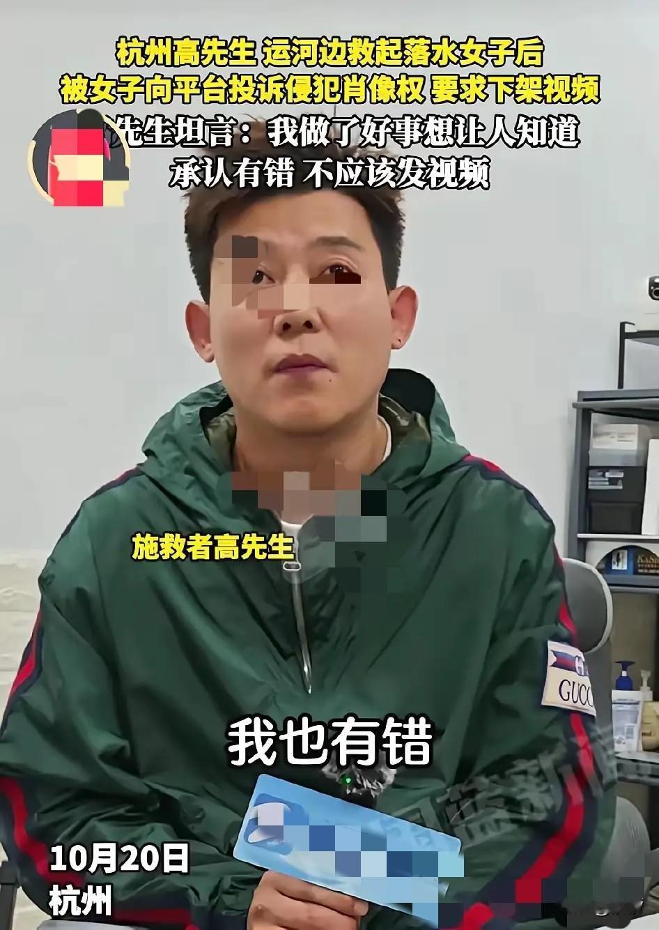 这两天杭州挺热闹, 面馆扣面方兴未艾, 如今高先生运河救人发视频纪念, 被救女子反而举报人家, 侵犯人家肖像权, 这可让网友吵翻了天, 如今更多细节爆出, 高先生也发视频表示自己有错, 自己救人不应该发视频, 不希望这件事对于被救者有影响, 之前由于自己被人发私信辱骂, 就是想发出来证明自己, 弘扬正能量, 自己也是第一次做好事, 没想到会弄成这样, 自己当时我受伤了, 丢了价值几百元的物品, 还去医院打了破伤风, 虽说有点心寒, 但还是希望网友不要再网暴被救女子, 看得出来高先生真是一个善良的人, 大家对于高先生承认自己有错怎么看? 杭州爆料 江苏小伙救人 江苏救人