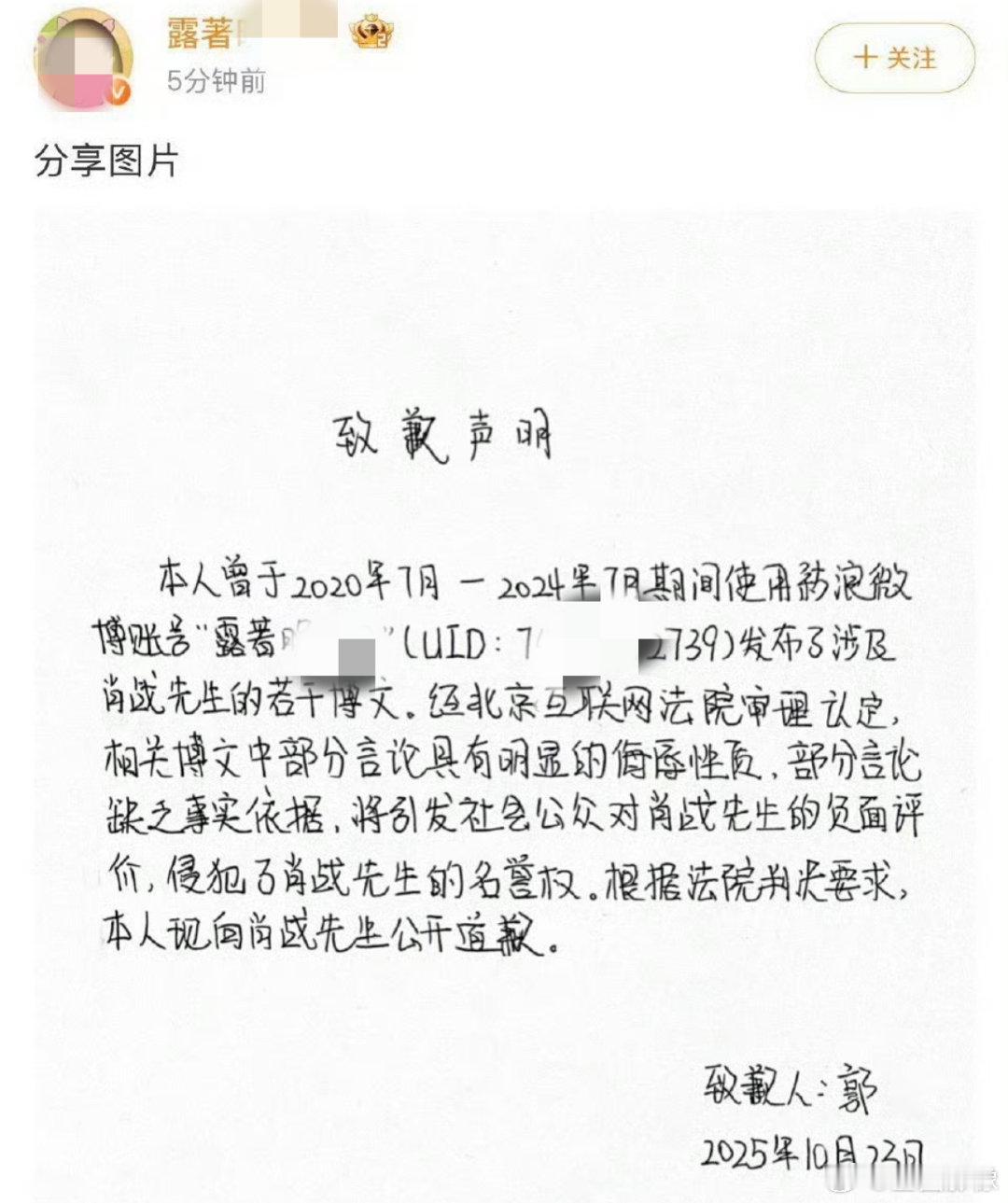 又一个交社保的职黑给肖战手写道歉信了,这个账号我印象老深刻了,她会关注一些经常发