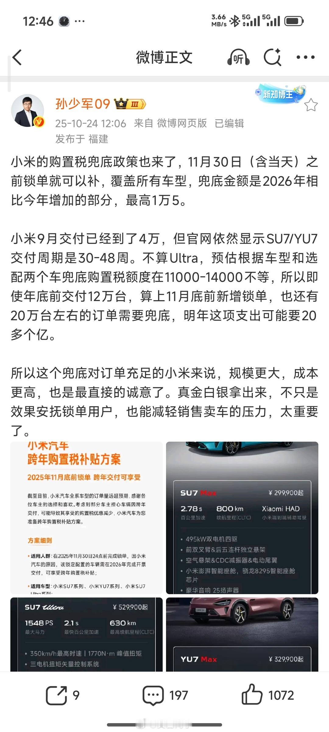 这个时候小米宣布全系兜底购置税,不区分车型,起步就是起码20-30亿的资金出去了,这对所有小米准车主们是实实在在的利好。而且兜底时间截止到11月底,也给了准备选择小米汽车,然后因为交付问题犹豫的朋友,这下也能彻底打消疑虑了。