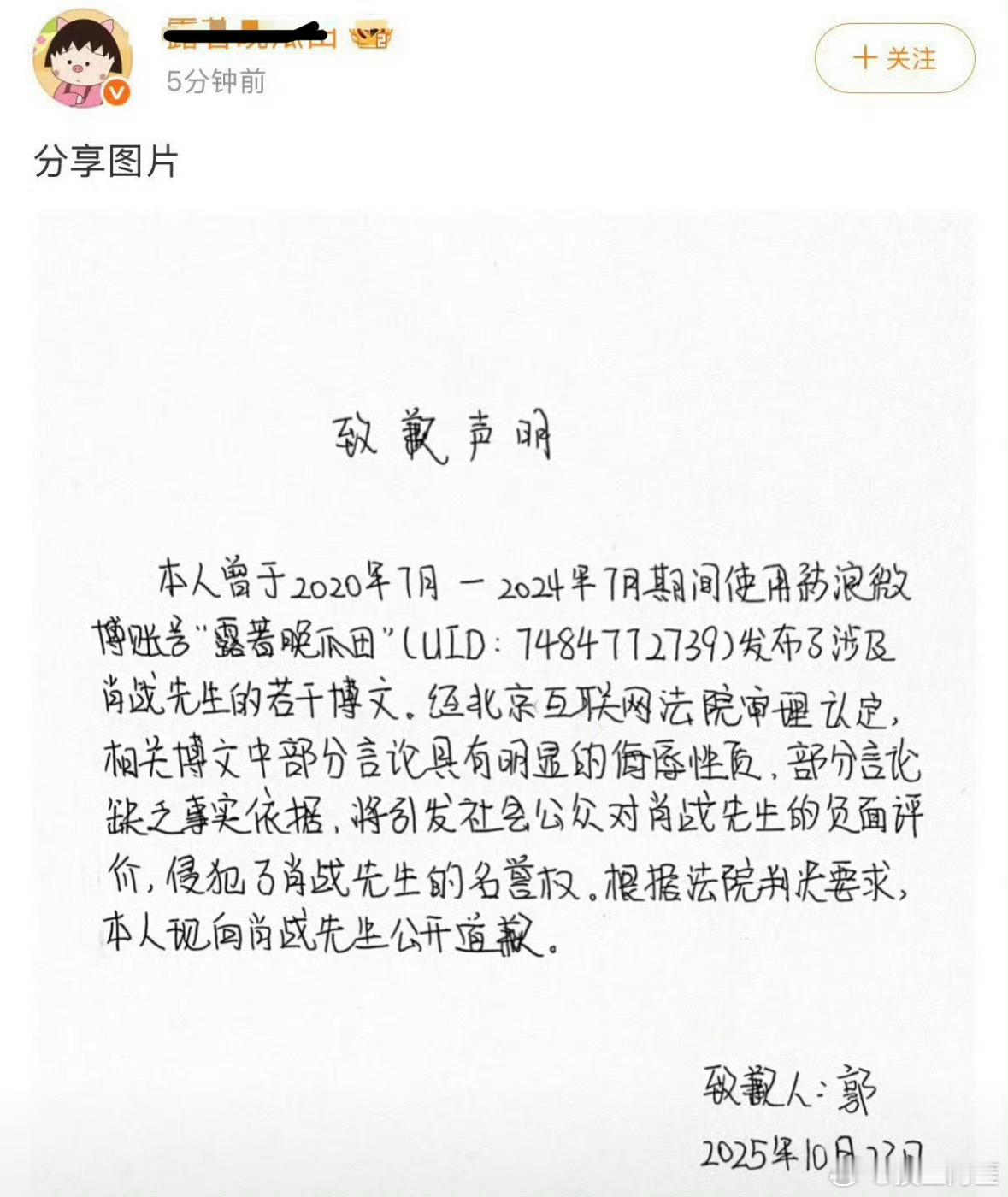 有一个黑粉给肖战道歉了……这个id我记得一点,好像总是生活在自己的世界里[泪奔]