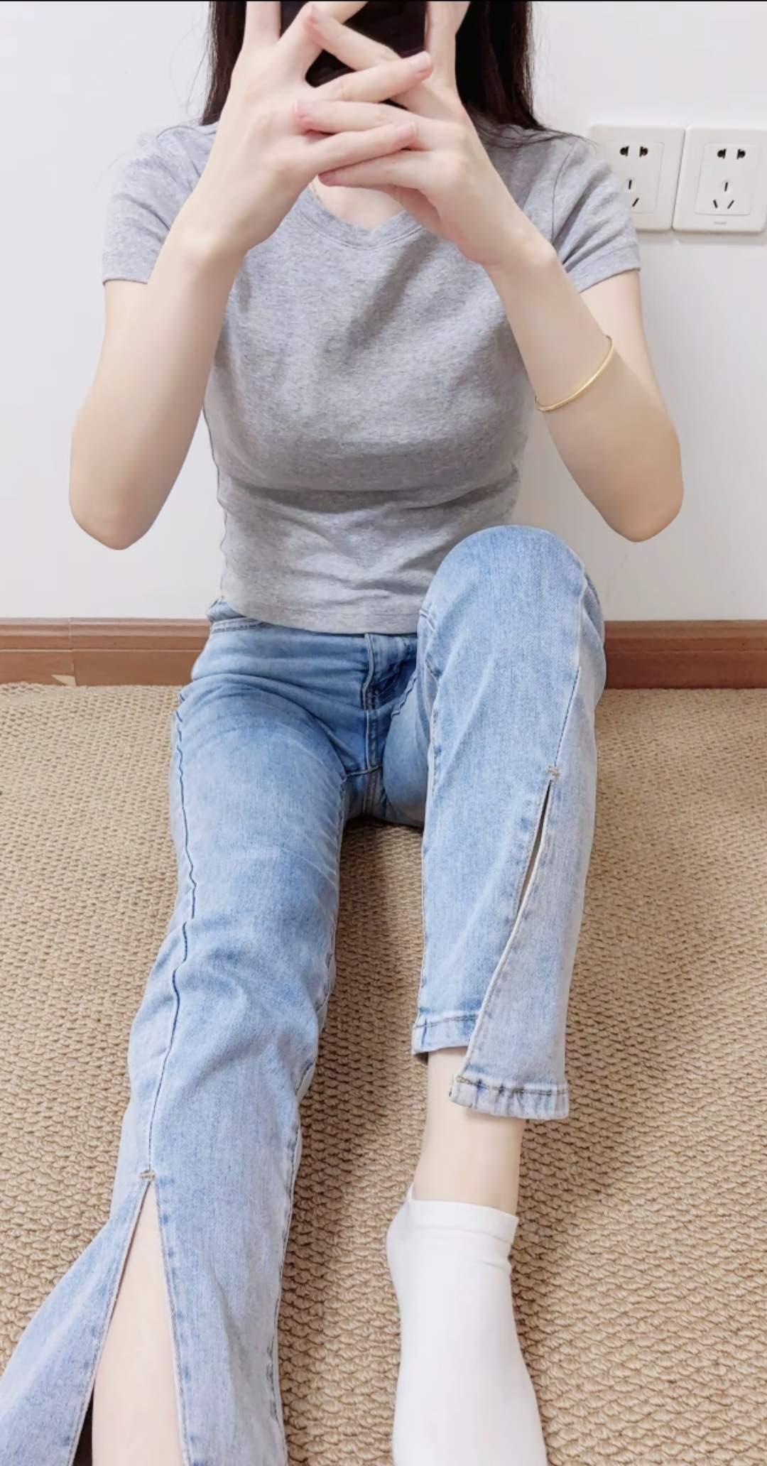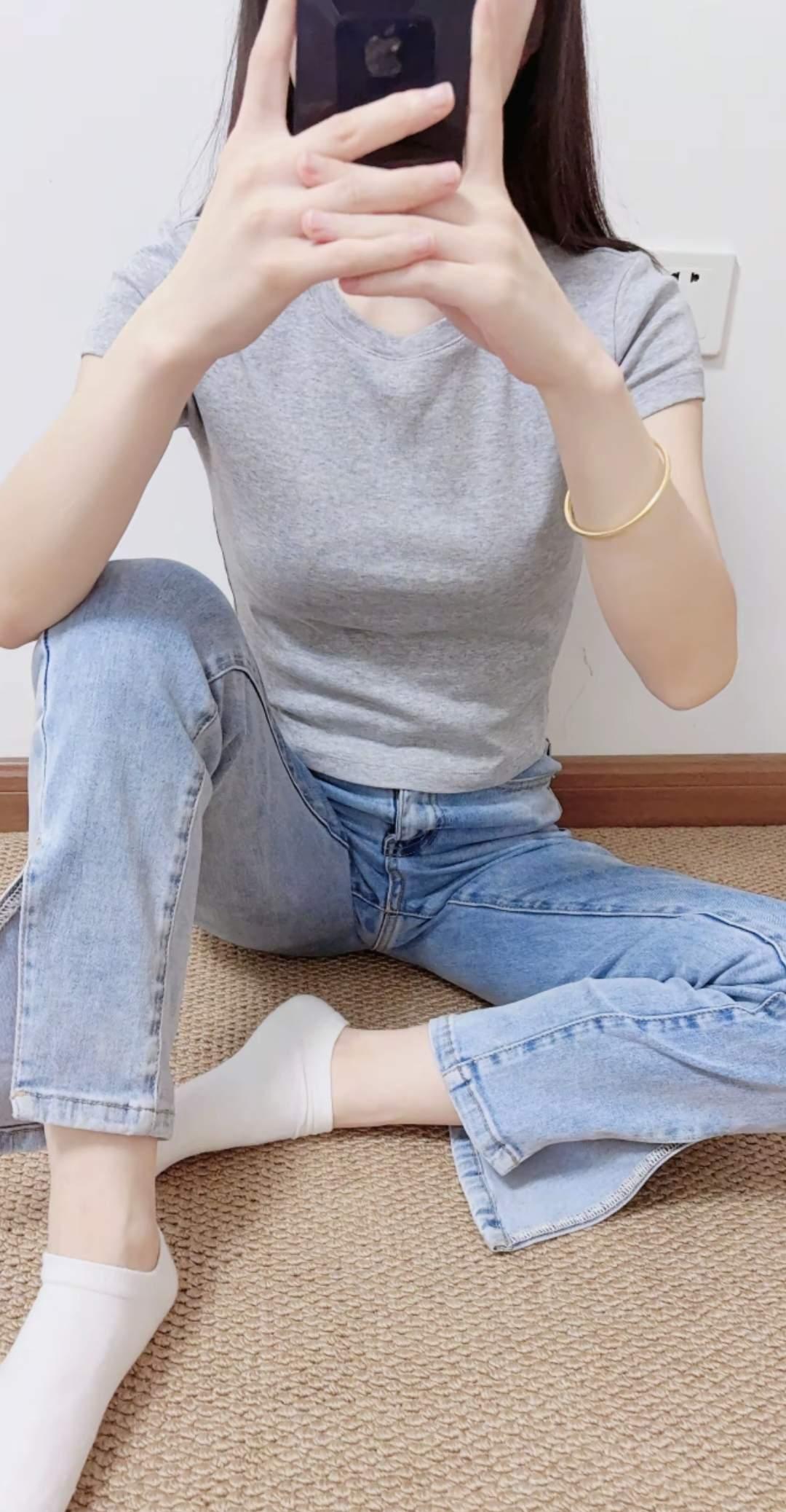 身着简约的灰色T恤和浅蓝色牛仔裤,展现出一种清新自然的风格。