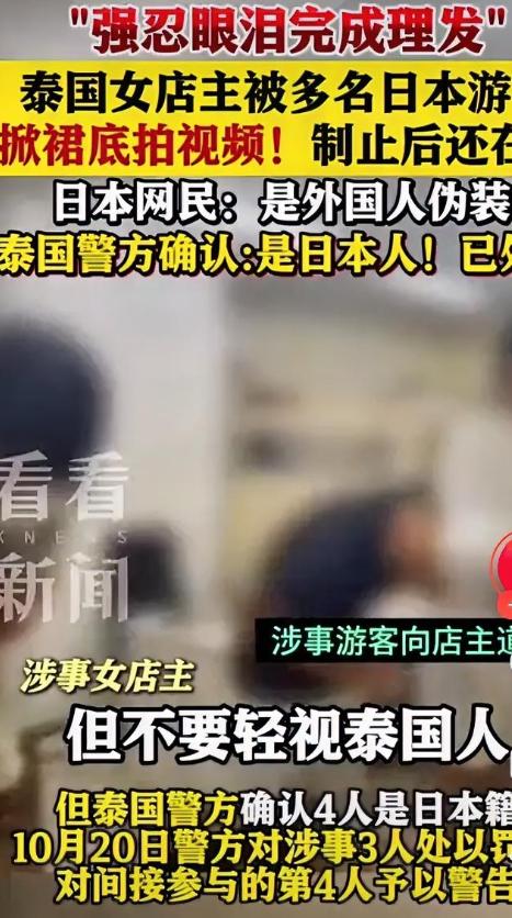近日,4名日本籍游客在泰国一理发店理发时,其中3人毫无遮掩的对正在剪发的泰国女店主实施掀裙窥视,事发后遭女店主呵止报警。 表面道貌岸然,背后狼心狗肺!世界真正的野兽,已没有生存空间,那么它只能伪装成人类,但有时它们的兽性大发就露馅了! 古称“倭”是真的贴切,骨子里的龌龊真的根深蒂固!日本当年发动的侵略战争实施的三光政策。证明了如今日本人的虚伪! 日本人是都有两面性的,在国内规规矩矩,在国外就不守规矩了,集体活动素质极高,个人行动时就没素质了!