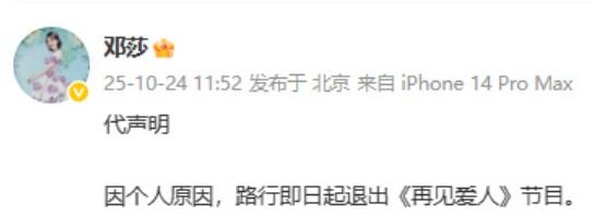 演员邓莎宣布自己丈夫路行退出《再见爱人5》,理由是个人原因。 最主要的原因不是路行说邓莎对家庭最大的贡献是“生儿子”,总演丫鬟宫女之类的话,而是因行贿风波。 国裁判文书网发布的一则刑事判决书显示,其曾向某退休干部赠送价值812.44万元创联控股股票3141万股、现金人民币160万元、价值人民币47万元的福卡等。 受贿者已于2024年获刑10年6个月,但法律认定路行属“被索贿且未获利”故免责,但公众认为行贿破坏公平原则,应一视同仁追责。 大众认为这样的劣迹人物不该出现在荧幕上,也认为节目组工作缺失,未进行背调。只为了话题性,而忽略更重要的内容,实在不应该。 路行退出看似个人选择,实则是法律、伦理、舆论多重压力下的必然结果。事件折射出公众对名人“双重标准”的零容忍,亦推动行业重新审视娱乐至上的边界。 不知道各位对于这件事是什么态度,支持还是反对呢?
