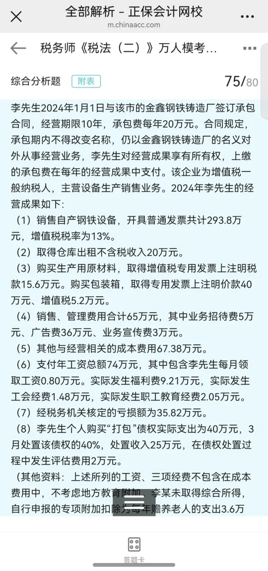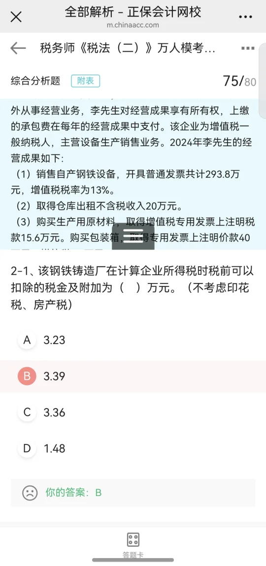 多选错了好多 综合题完全不懂是什么意思 有没有答案解析啊 还要继续努力 大家税二多少分啊 这套题难易程度如何? . 有点慌 实务还没学完呢