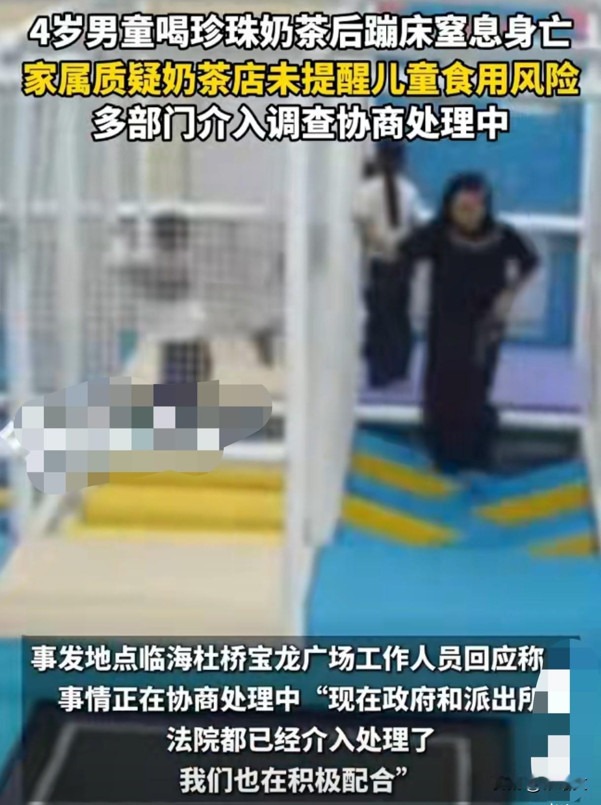 一口珍珠夺走4岁娃性命!是奶茶店的锅,还是家长没看住? 谁能想到啊,甜甜的珍珠奶茶能成“夺命杀手”!浙江台州那个4岁男娃,喝口奶茶去蹦床,转眼就没了,这事听着就让人揪心。 事发在宝龙广场,娃喝完奶茶就扎进蹦床区疯玩。没一会儿就出事了,珍珠反流卡住喉咙,任凭家长怎么拍背都没用,最后没抢救回来。 家属哭得快晕过去,转头就找奶茶店讨说法:“连个警告告示都没有,也没跟我们说小孩不能喝!”这话一出,网上立马吵翻天了。 可有人扒出来,奶茶杯身上明明写着“老人儿童需监护饮用”。更要命的是,游乐场压根不让带吃喝进去,是家长偷偷带进去的。 记者赶紧去问商场,人家就说在协商,政府、派出所都介入了。找奶茶店,店员就一句“公司在处理”,问镇政府,值班的啥也不知道。 这事儿一曝光,相似的案例全冒出来了。去年山东有个5岁娃,也是珍珠卡喉,幸亏邻居会急救才捡回一条命。 还有个北京大姐,喝奶茶被珍珠噎得直翻白眼,刚好有护士路过用急救法救了她。医生说珍珠又黏又滑,特容易堵气管。 咱得掰扯掰扯这事儿的根儿。首先奶茶店有责任,光印小字不够,店员见带娃的就该多提醒几句,这又不费事儿。 但家长的责任更大啊!2到5岁的娃呼吸道特窄,最容易卡异物,还让他边吃边蹦,这不是把危险放跟前儿嘛。 再说急救这事儿,多少人光听过没见过。长沙120的专家说,异物卡喉黄金抢救时间就4到10分钟,等120来早晚了。 教你们个救命的海姆立克急救法,对小孩特管用。站在娃身后,拳头放肚脐上方,往上快速冲击,直到异物出来。 别觉得这事儿离自己远,每年被零食、坚果卡喉的娃不老少。之前洛阳那个3岁女童,也是珍珠卡喉,多亏有医护人员在场。 现在好多家长带娃太“佛系”,总觉得危险离得远。殊不知娃嘴里含着东西跑跳、大笑,都是埋雷,一秒钟就能出事。 奶茶店也得长点心,别光想着赚钱。要么直接标注“儿童慎食珍珠”,要么店员主动提醒,多句嘴可能就救条命。 这事儿哪是奶茶的错啊,是咱们对“小口慢吃、专人看护”这八个字太不当回事了。娃的安全容不得半点马虎,一次疏忽就是一辈子的痛。 这起悲剧给所有人敲了警钟:带娃出门,眼睛得像探照灯似的盯着,嘴里含东西绝对不能跑跳。你身边有人真的会海姆立克急救法吗?评论区说说,多个人会就多份保障。