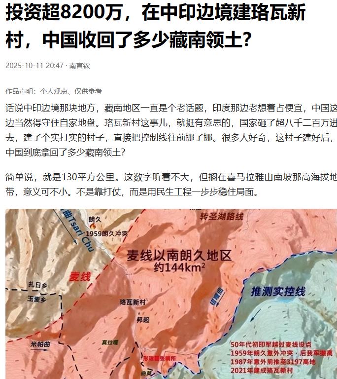 其实,中国领土上最难解决的问题不是台湾回归,也不是南海争端,而是中印边境的收复问题。 台湾问题说到底是家里的事,不管外人怎么吵,国际上都认一个中国,咱们国内更是一条心,只要时机到了,解决只是早晚的事。 南海那边,咱们实际控制着不少岛礁,周边国家国力有限,真要较真他们也扛不住,而且咱们有国际法撑腰,慢慢经营总能理顺。 但中印边境不一样,历史、地理、实际控制这几摊子事缠在一起,每一件都比想象中难办。 就说这历史烂摊子,1914年英国殖民主义者凭空画了条“麦克马洪线”,把原本属于中国的藏南地区划给了英属印度。 1962年虽然打了场边境战争,但战后咱们出于和平考虑撤了军,印度反倒趁机占了藏南大部分地方,上世纪80年代还敢把这地方改成所谓的“阿鲁纳恰尔邦”,明目张胆地把别人的东西当成自己的。 更麻烦的是,这么多年下来,印度往藏南移了800多万人,这些人在当地定居、生活,硬生生把历史遗留问题变成了“人占着地方”的现实难题,不是一句“历史上是我们的”就能立刻解决的。 还有地理条件更是雪上加霜,中印边境多在海拔4000米以上的高山,光东段的巴嘎沟通道每年就有半年大雪封山,根本没法通行。 林芝机场算是边境少有的交通枢纽,但南边2公里外就是印度的军用机场,人家的战机起飞一两分钟就能临空,这距离近得让人揪心。 中国想往边境送点物资,夏天要防山洪,冬天要破冰雪,以前靠骡马运输,一趟得走十几天,现在修了公路还是得看天气脸色。 印度那边也好不到哪去,但他们仗着离平原近点,硬是往拉达克和东北部塞了两个坦克旅,348辆坦克加180辆步兵战车,把边境变成了重兵对峙的“火药桶”。 你说要推进实控线吧,每往前挪一步都得先修公路、建定居点,国家在珞瓦新村砸了8200多万,花了四年才往前推了5公里,多控制130平方公里,这速度放在9万平方公里的藏南面前,简直像蚂蚁搬家。 实际控制上的拉扯更让人头疼。咱们在南伊沟建个女子边防派出所,本来是为了服务旅游和边民,结果印度立马借机增兵一个师,搞“草木皆兵”那一套。 他们在争议地区设据点、修工事,还规定边民必须用印度身份证,咱们则靠“家家是哨所,人人是哨兵”的办法固边,珞瓦新村建好后,村民定居下来种地放牧,巡逻道跟着往南延伸3公里,这才慢慢把实控线稳住。 但印度移民基数太大,800多万人已经形成了完整的生活体系,真要动起来,不是简单的“驱离”就能解决,弄不好还会被西方炒作成“人道主义问题”。 更有意思的是,印度军方还憋着歪主意,说要是开打就“对等占领中国领土”,这种泼皮逻辑让对峙更难化解。 国际势力还总来插一脚。美国看准了印度能牵制中国,又是卖武器又是搞联合军演,英国当年画的线现在还被印度当成“法理依据”,时不时拿出来说事。这些国家不盼着问题解决,就盼着中印闹矛盾,好坐收渔利。 咱们处理台湾问题有“一个中国”原则打底,南海有《联合国海洋法公约》撑腰,可中印边境连个公认的边界条约都没有,每次谈判都得从历史账算起,谈十几次都难有实质进展。 这么多事儿拧成一团,中印边境收复的难度可想而知。台湾是家里事,共识在、法理在,解决只是时间问题;南海有实控、有优势,周边国家掀不起大浪。 可中印边境,英国留下的烂账没清,高山峡谷的地形卡着脖子,印度占着地方还迁了几百万移民,外面还有国家跟着搅浑水,每一步都得算着走、稳着来。 这事儿不像挖黄河泥沙那样有明确的难度参数,也不像娱乐圈换人设那样简单直接,它藏着历史的褶皱、地理的阻碍和人心的博弈。 但难不代表没办法,珞瓦新村推进的5公里,边民守边的每一步,都是在给解决问题铺路。 毕竟领土问题从来不是急出来的,是靠实力、耐心和智慧一点点磨出来的,这才是大国处理难题的真正门道。