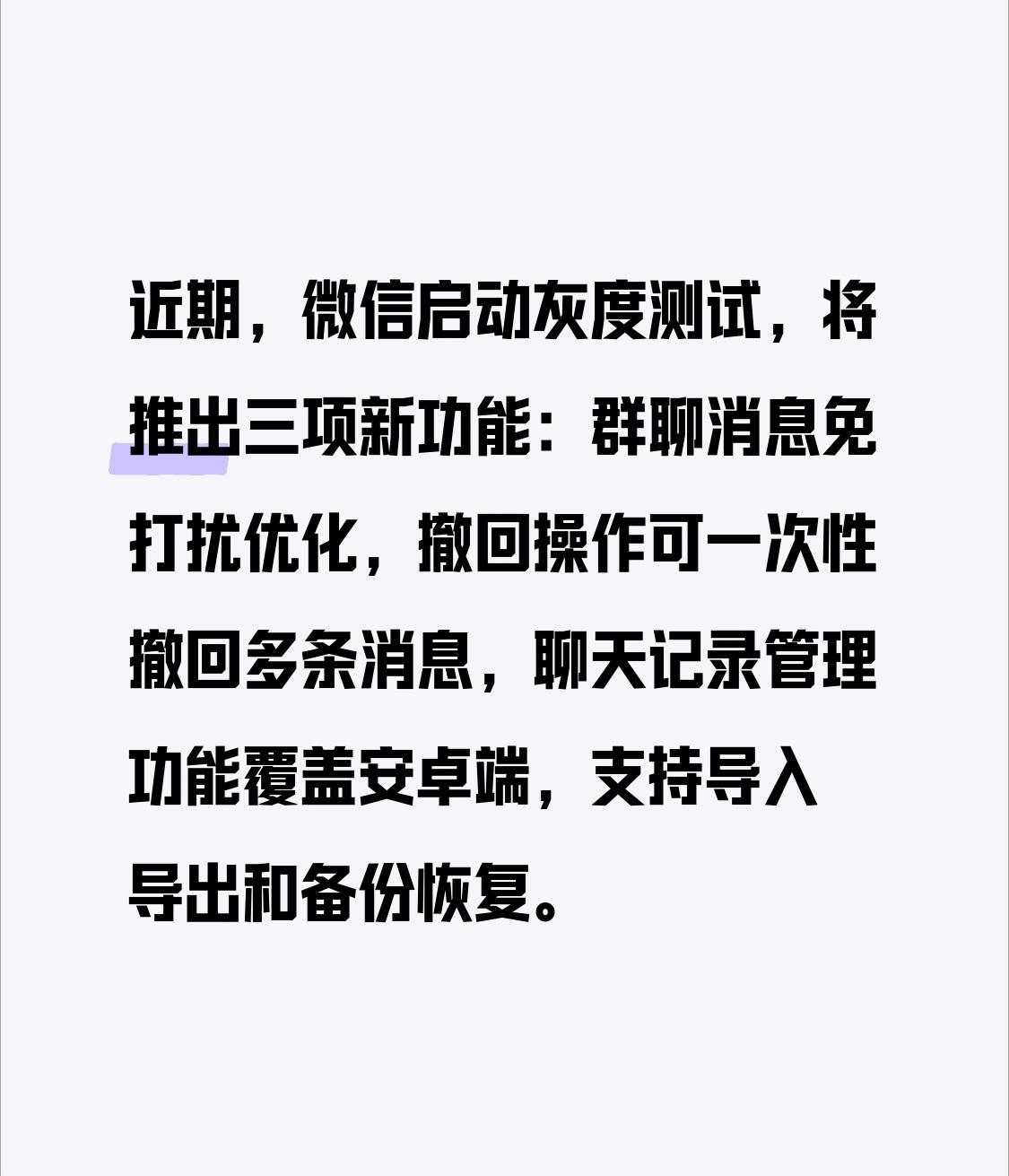 近期,微信开启了灰度测试,准备推出三项超实用的新功能,就像给微信这个“大工具箱”又添了几件趁手的工具。一是群聊消息免打扰优化;二是撤回操作可以一次性撤回多条消息,就像一键清理“聊天垃圾”;三是聊天记录管理功能覆盖安卓端,支持导入导出和备份恢复。