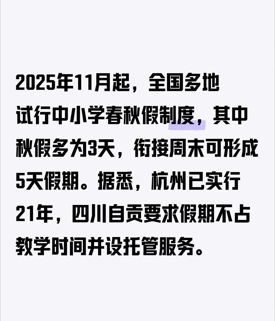 2025年11月起,全国好多地方都开始试行中小学春秋假制度啦。这秋假呢,大多是3天,要是和周末连上,就像给假期加了个“小翅膀”,能形成5天的假期。据说,杭州都已经实行这制度21年了,四川自贡还要求这假期不能占教学时间,并且还设置了托管服务呢。
