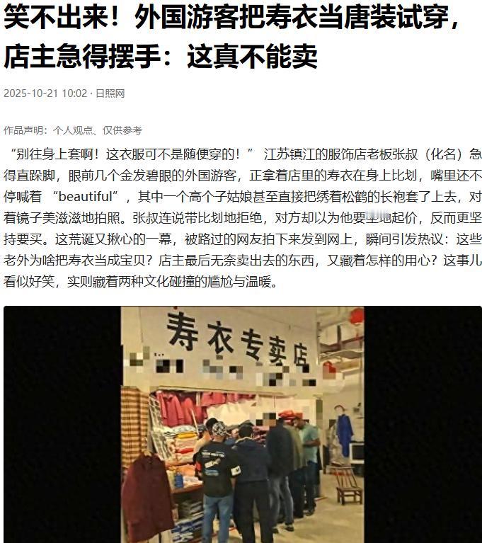 在中国死人才穿的寿衣,旅游的老外看上了!而且价格便宜,看看活人穿上寿衣的样子,真好看! 说白了,这事说出来能惊掉不少人的下巴,我们中国人只有在人没了才会穿的寿衣,居然被来旅游的老外当成宝贝一样看上了,不光觉得价格便宜,还直接穿在身上逛街,更让人没想到的是,活人穿上这寿衣,居然还挺好看! 这背后最根本的原因,还是中外的文化差得太远了。咱们中国人打老辈儿就讲究“事死如事生”,寿衣是给逝者“上路”穿的衣裳,承载着活人对去世亲人的敬重和念想,从款式到做工都有不少讲究。 比如衣裤件数得是奇数,不能用纽扣得用飘带,面料多选绸缎棉布,绣着松鹤、龙凤这些寓意吉祥的纹样,连穿寿衣的人都有讲究,男性逝者一般由儿子女儿料理穿戴,女性则由女儿儿媳动手,处处透着对逝者的郑重。 可老外那边根本没有这种专门的丧葬服饰传统,他们参加葬礼大多穿普通的黑西装、黑裙子,顶多讲究个肃穆,从没见过这种带着精细刺绣的成套服饰,自然不会往“丧葬”上联想。 江苏镇江就出过这么一档子乌龙事,几个外国游客背着双肩包钻进老巷子里的服饰店,直奔里间的寿衣区,拿起件绣着松鹤的深蓝色长袍就往身上套,对着镜子美滋滋拍照,嘴里还不停喊美丽。 店主急得直跺脚,连说带比划禁止销售,人家反倒以为要坐地起价,掏出百元大钞硬要买。后来才搞明白,这些老外看了旅游攻略找“中国传统刺绣服饰”,没分清寿衣和唐装的区别。 无独有偶,广西还有网友见过非裔女子穿着寿衣逛街购物,显然也是把这当成了特色时装。 价格便宜更是戳中了老外的痛点。寿衣这东西在国内线下店卖得挺贵,成本142元的三件套能卖到2000多,翻了十好几倍,但批发价其实低得惊人,天津寿衣批发村的三件套最低才35元,就算是真蚕丝的成本也不过1000元左右。 电商平台上更划算,淘宝拼多多上的寿衣大多200到600元就能拿下,比老外当地动辄几百美元的复古服饰便宜太多。 有跨境电商卖家说,现在发往欧美的寿衣订单涨了近3倍,老外问得最多的是“龙和仙鹤代表什么”,对价格倒是不怎么敏感,毕竟换算过去也就几十美元,买件有东方特色的“复古装”太值了。 还说寿衣的设计本身就藏着东方美学,确实符合老外对“中国风”的想象。那些盘扣的弧度、刺绣的纹样,还有宽袍大袖的版型,跟他们追捧的汉服、旗袍风格相近,只是咱们因为文化禁忌不把它当日常服饰。 寿衣用的绸缎面料有光泽,绣的寿字、云纹图案精致,放在任何地方看都是件做工扎实的衣裳。老外眼里可没有“丧葬专用”的滤镜,只觉得这衣服款式独特,比快时尚品牌的流水线产品有质感,自然乐意穿在身上。 还有个容易被忽略的点,老外对“死亡符号”的敏感度跟咱们完全不一样。咱们看到寿衣会联想到离别和悲伤,可在不少欧美国家,骷髅头图案能印在T恤上,乌鸦元素能做时尚配饰,死亡相关的符号早被解构得没那么沉重。 他们没有“穿寿衣不吉利”的心理负担,纯粹从实用和审美出发,觉得这衣服好看、便宜、有特色,就愿意买回去穿。 就像电商平台上那些月销几千的寿衣店,不光卖国内顾客,不少订单都发往海外,卖家干脆在标题里写“东方复古刺绣上衣”,避开文化禁忌的同时,正好戳中老外的需求。 其实这事说穿了就是场有趣的文化碰撞,没有谁对谁错。咱们眼里的“丧葬服饰”,在老外那儿就是件性价比高的东方美衣,他们不懂背后的习俗,只看到了刺绣的精美和款式的特别。 寿衣本身的设计确实经得起打量,那些流传下来的纹样和工艺,本就是中国传统服饰文化的一部分,只是被赋予了特殊的使用场景。 随着中外交流越来越多,这种“误打误撞”的审美发现只会更多。说不定哪天寿衣上的盘扣、云纹会被时尚品牌借鉴,变成真正的流行元素。 毕竟好看的设计、扎实的工艺从来不分使用场景,老外的“另类青睐”反而让这些藏在丧葬习俗里的东方美学被看见。 这种碰撞没有冒犯,反倒成了文化交流的小切口——当咱们笑着解释寿衣的讲究,老外听着故事欣赏衣服的美,那些原本的文化隔阂,就在这桩桩件件的新鲜事里慢慢消解了。