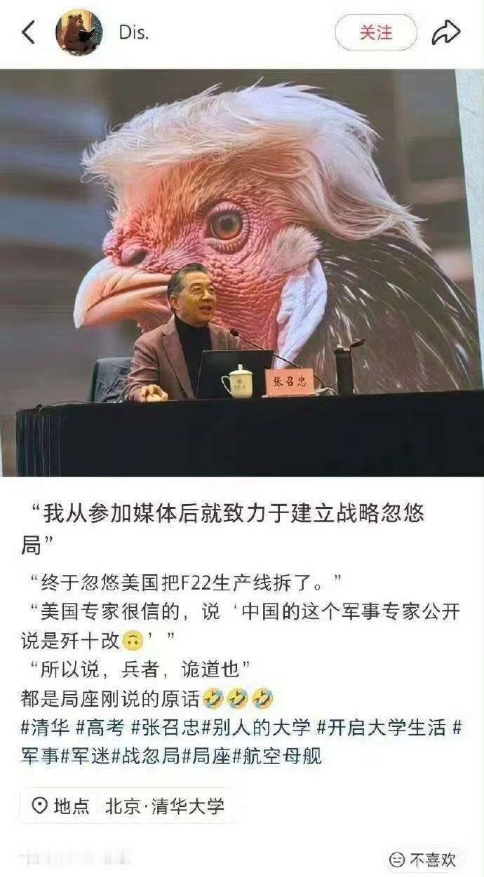 有网友分享(有待进一步证实),在此次讲座中,局座张召忠亲口表示“我从参加媒体后就致力于建立‘战略忽悠局’”、“终于忽悠美国把F-22生产线拆了”,这似乎还是局座首次承认自己建立“战忽局”。
