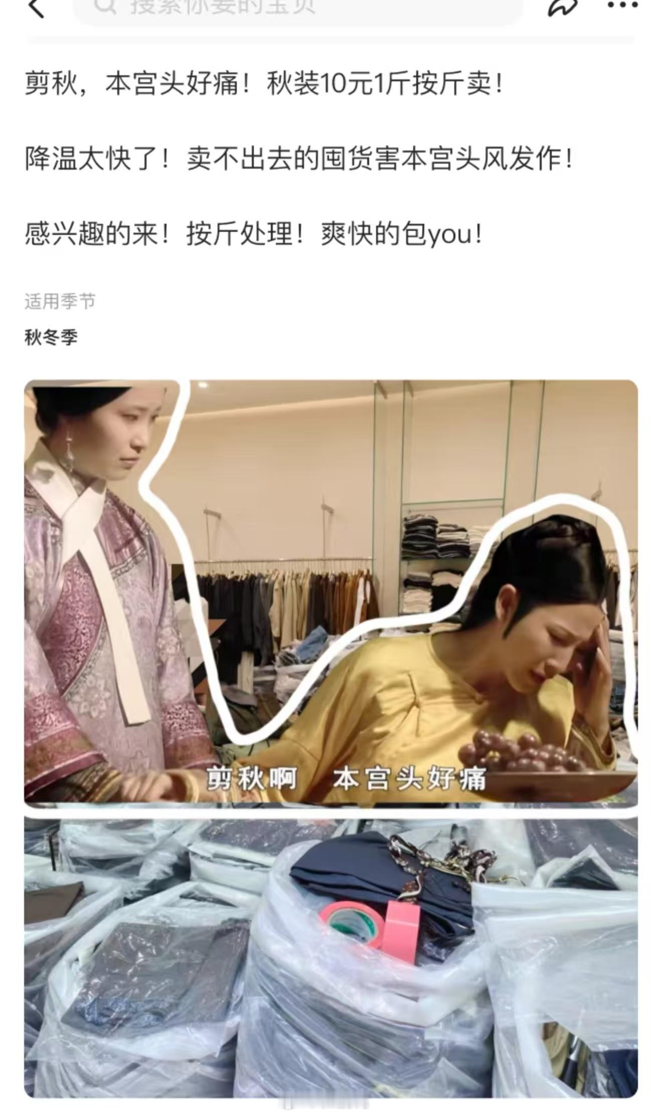 剪秋的秋装被按斤转卖了笑死,衣服还能按斤卖[哈哈],以后下单之前,先上闲🐟瞅瞅,很多双十一转单、工厂尾货都会在闲🐟出,质量又好又便宜,对捡漏人很友好了!