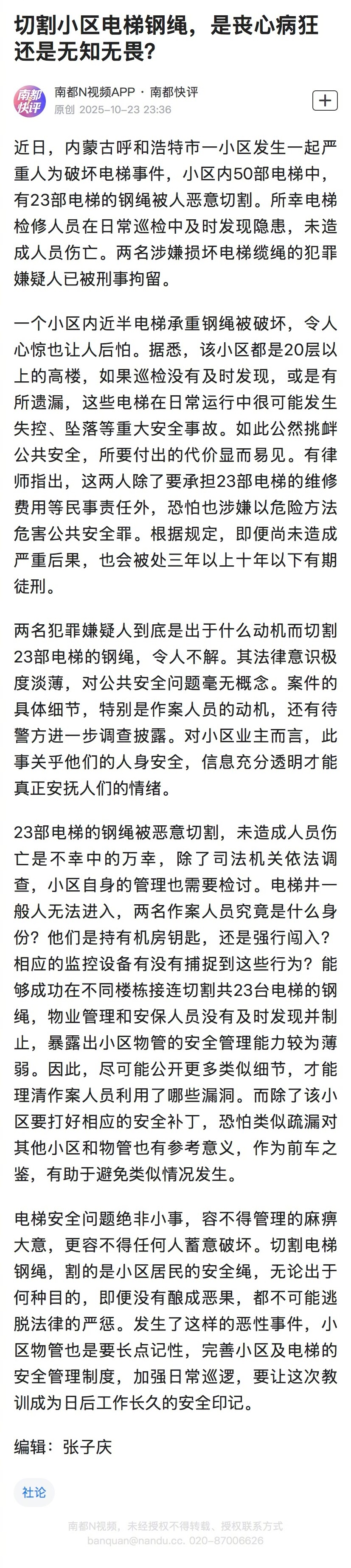 #割电梯钢绳是丧心病狂还是无知无畏#【南都快评:切割小区电梯钢绳,是丧心病狂还是无知无畏?】#公共安全不容挑衅##呼市一小区50部电梯中23部遭割绳#两名犯罪嫌疑人到底是出于什么动机而切割23部电梯的钢绳,令人不解。其法律意识极度淡薄,对公共安全问题毫无概念。案件的具体细节,特别是作案人员的动机,还有待警方进一步调查披露。对小区业主而言,此事关乎他们的人身安全,信息充分透明才能真正安抚人们的情绪。