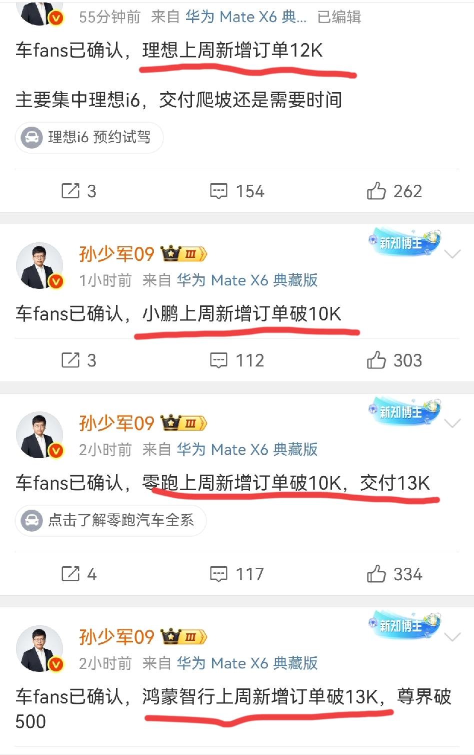 鸿蒙智行上周新增订单13K 理想汽车上周新增订单12K 小鹏汽车上周新增订单10K 零跑汽车上周新增订单10K理想汽车 理想销量排行榜 鸿蒙智行App 零跑凭啥成为第二家盈利新势力 理想成为一百万家庭的选择凭什么 30万级纯电SUV就选小鹏G9