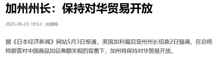 加州州长跑到北京,当着一堆美国记者的面,扔下一句话:“中国越成功,世界就越成功。”我都能想象到现场那些美国记者下巴掉地上的样子——天天喊着“脱钩”,你这浓眉大眼的家伙怎么第一个就“叛变”了? 加州州长这哪儿是叛变,根本是为自家地盘的利益没法装下去了,毕竟美国政府嘴上喊的“脱钩”不能当饭吃,加州的日子好坏全跟中国绑在一起。 就说最实在的贸易账,这可是加州的命根子。2024年加州对华贸易额足足有1650亿美元,占了全州进出口总额的24%,中国早就成了它最大的贸易伙伴。 洛杉矶港更直观,洛杉矶港近一半集装箱都跟中国贸易沾边,货柜里堆的全是真金白银的生意,哪有什么 “脱钩” 空话?加州是世界第五大经济体,靠中国市场撑着体量。真听华盛顿瞎指挥,港口工人、中小企业的饭碗第一个就得掉,这经济引擎立马歇火。 就说加州的农业吧,它供应着全美1/3的蔬菜和75%的水果坚果,简直是“美国粮仓”。 这些农产品里,杏仁是头号出口项,2024年光这一项就卖了58亿美元,而全球76%的杏仁都产自加州。中国市场对这些杏仁有多重要? 之前贸易战的时候,中国一加征50%关税,加州杏仁种植户差点哭了,因为澳大利亚早就虎视眈眈等着抢市场。 葡萄酒行业更惨,35%的关税加下来,那些做了十几年中国生意的酒厂老板直接“很受伤”,好不容易攒下的客户说没就没。 农民可经不起折腾,种庄稼、搭葡萄架都是提前好几个月做的决定,“脱钩”带来的不确定性,比干旱还让他们头疼。 还有科技这边,硅谷是加州的王牌,可这王牌离了中国根本打不出去。特斯拉的上海工厂贡献了它全球65%的利润,要是没中国市场撑着,硅谷的科技巨头们财报都没法写。 而加州那个MPMaterials公司,是美国唯一能搞稀土全产业链的企业,当年它接手的莫哈韦沙漠稀土矿早就破产了,全靠和中国企业合作,拿资金换技术,才把矿重新开起来,后来还能拿到国防部拨款,跟苹果合作搞稀土回收生产线。 反过来看,英伟达就是个教训,美国一搞出口管制,它在华高端芯片市场份额直接从95%跌到0%,这可是真金白银的损失,硅谷的老板们心里门儿清。 最关键的是就业,这直接关系到加州老百姓的饭碗。光对华贸易就支撑着加州60多万个就业岗位,从港口工人、卡车司机到农场劳工,多少人指着这笔生意活。有测算说要是真脱钩,超过300万加州人得失业,这可不是小数目,纽森要是跟着喊“脱钩”,下次选举根本没法向选民交代。 洛杉矶港的工人最有发言权,他们每天装卸的集装箱里,一半多都和中国有关,要是这些箱子少了,第一个下岗的就是他们。 所以加州根本没辙,只能跟联邦政府叫板,2025年4月,加州总检察长直接起诉特朗普政府,说他单方面加关税违反宪法,破坏了三权分立原则。 这哪是“叛变”,分明是被逼的,华盛顿的政客喊口号不用负责,纽森得盯着加州的农田、工厂和港口,得对400万加州人负责。 之前贸易战的时候,加州就带头反抗,现在纽森说句大实话,不过是把早就做的事摆到台面上。 那些美国记者下巴掉地上,纯粹是把联邦的政治宣传当了真,忘了加州的经济命脉早跟中国拧成了一股绳。他们天天听“脱钩”,却没见过加州农民对着滞销的杏仁发愁,没问过硅谷老板失去中国市场的滋味,更不知道洛杉矶港工人最怕集装箱变少。 纽森不是叛徒,他只是个务实的州长,知道什么口号都不如老百姓有活干、有收入实在。 华盛顿的政客可以靠“脱钩”博眼球,但加州不能拿民生当赌注。 中国成功了,加州的杏仁能卖出去,特斯拉的车有地方销,稀土矿能继续开工,工人能按时领工资;要是中国发展受影响,加州的经济就得跟着打喷嚏。 这不是什么“站队”,而是全球化下的基本逻辑,现在的经济早就像一张大网,你中有我我中有你,硬要扯断,只会把自己也拖进去。 纽森不过是说出了所有务实者的心里话:比起空洞的政治口号,把自家地盘的日子过好,才是真的对世界负责。毕竟,稳定的合作比无谓的对抗,从来都更能让世界变好。