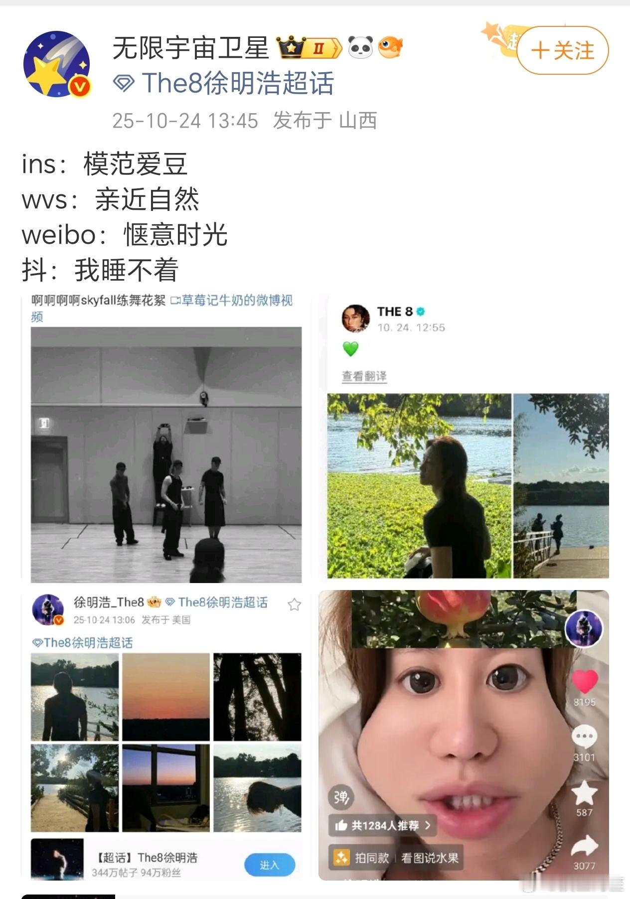 徐明浩美巡倒时差的时候仍然不忘营业,还是一人四色的内容,不同平台不同风格,哪里都走不出这个多重人格的徐明浩宇宙,就这样敬业的八老师[期待]