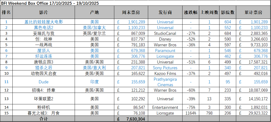 1.《盖比的娃娃屋大电影》开画夺冠,IP在英国还是很有实力的;