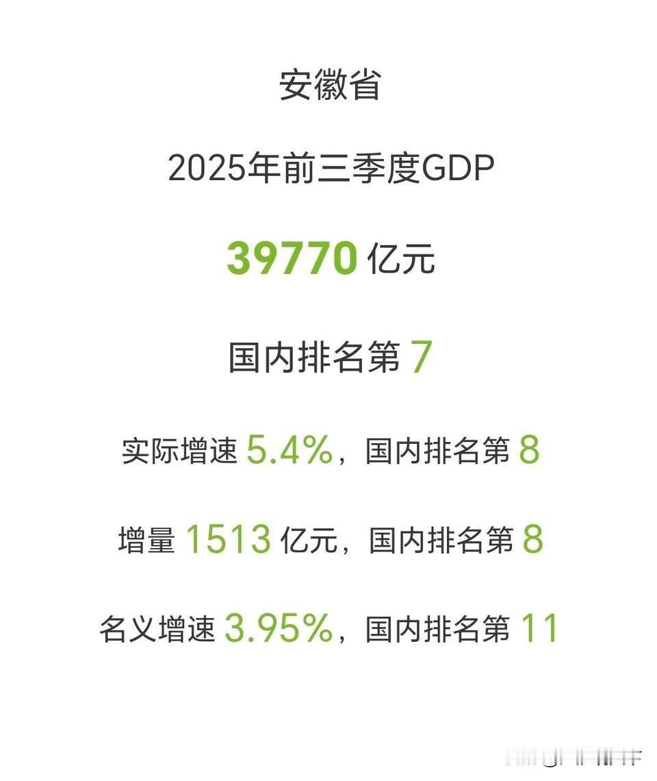 对比广东,安徽省的数据还可以接受 安徽省前三季度GDP数据39770亿元,增量1513亿元,名义增速3.95%,实际增速5.4%,名义增速还没有跑赢大盘。 安徽近几年也不知道怎么了?平时成绩个个都可以,就是一考试就拉胯,这个魔咒就打破不了吗? 安徽省2025年前三季度GDP,单纯从数据来看,别说出彩了,凑凑合合只能算及格,对比广东前三季度,又觉得安徽数据可以接受了。安徽 安徽经济排名 安徽经济实力 安徽GDP 安徽县域gdp 合肥经济增长 合肥GDP增速